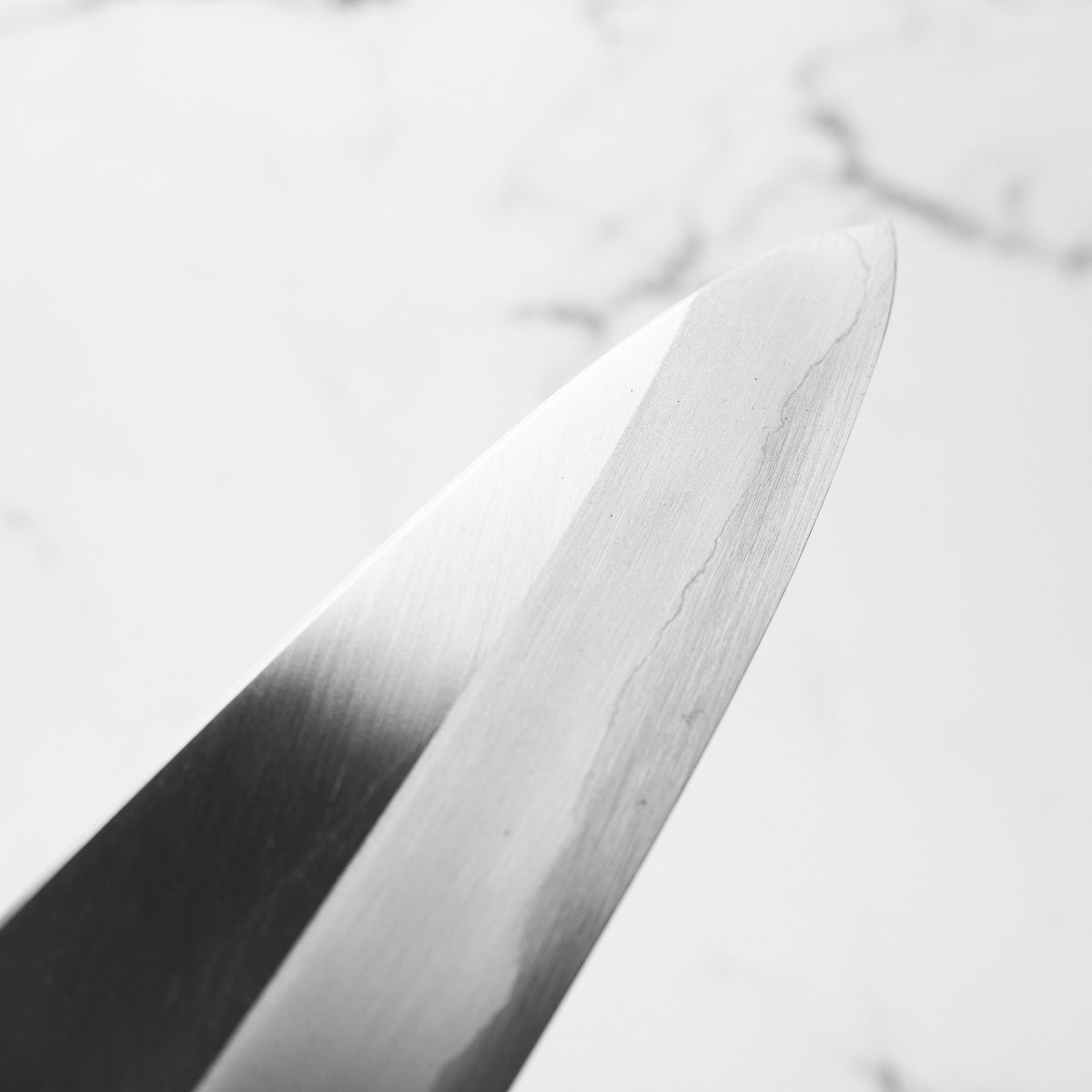Japanese Ginsan steel, also known as Silver-3 or G3, is an underrated high-grade semi-stainless steel loved by many for being in the ‘goldilocks zone’ of knife steels. It holds a very respectable edge, but is effortless to sharpen. It is considered the semi-stainless version of White 2. It is the knife steel of choice for many home cooks and professional chefs alike.