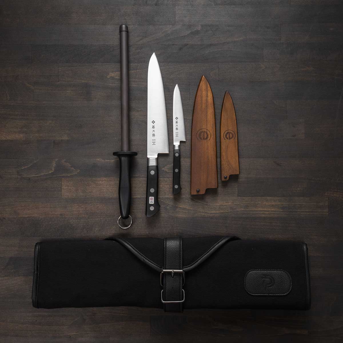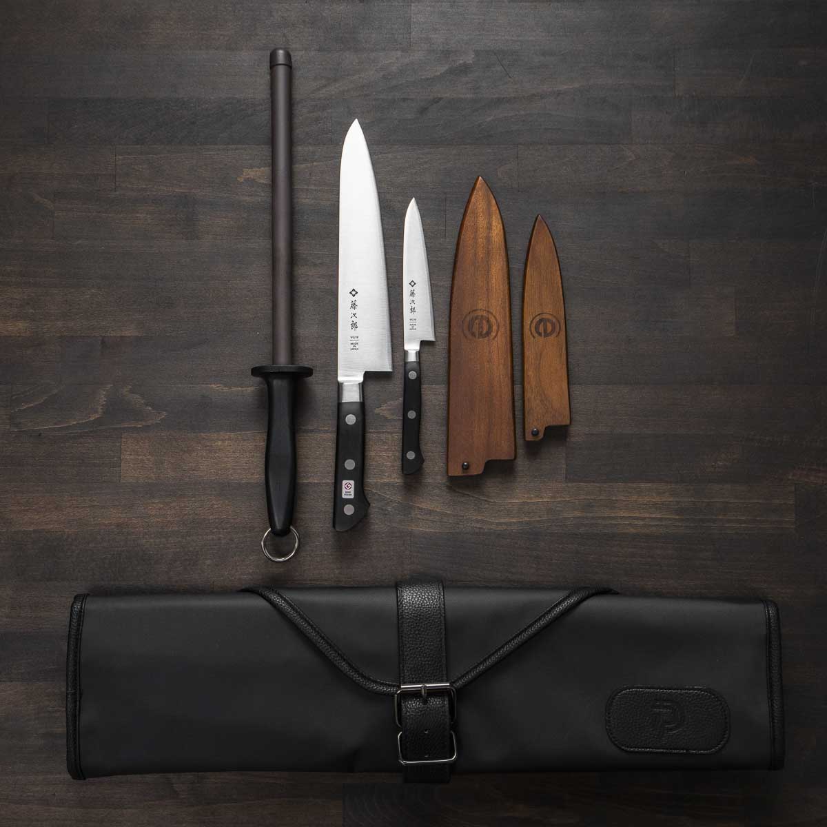 Bundle contains Gyuto 210mm, Petty 120m, Wooden Saya, Honing Rod & Porter 5 Pocket Knife Roll