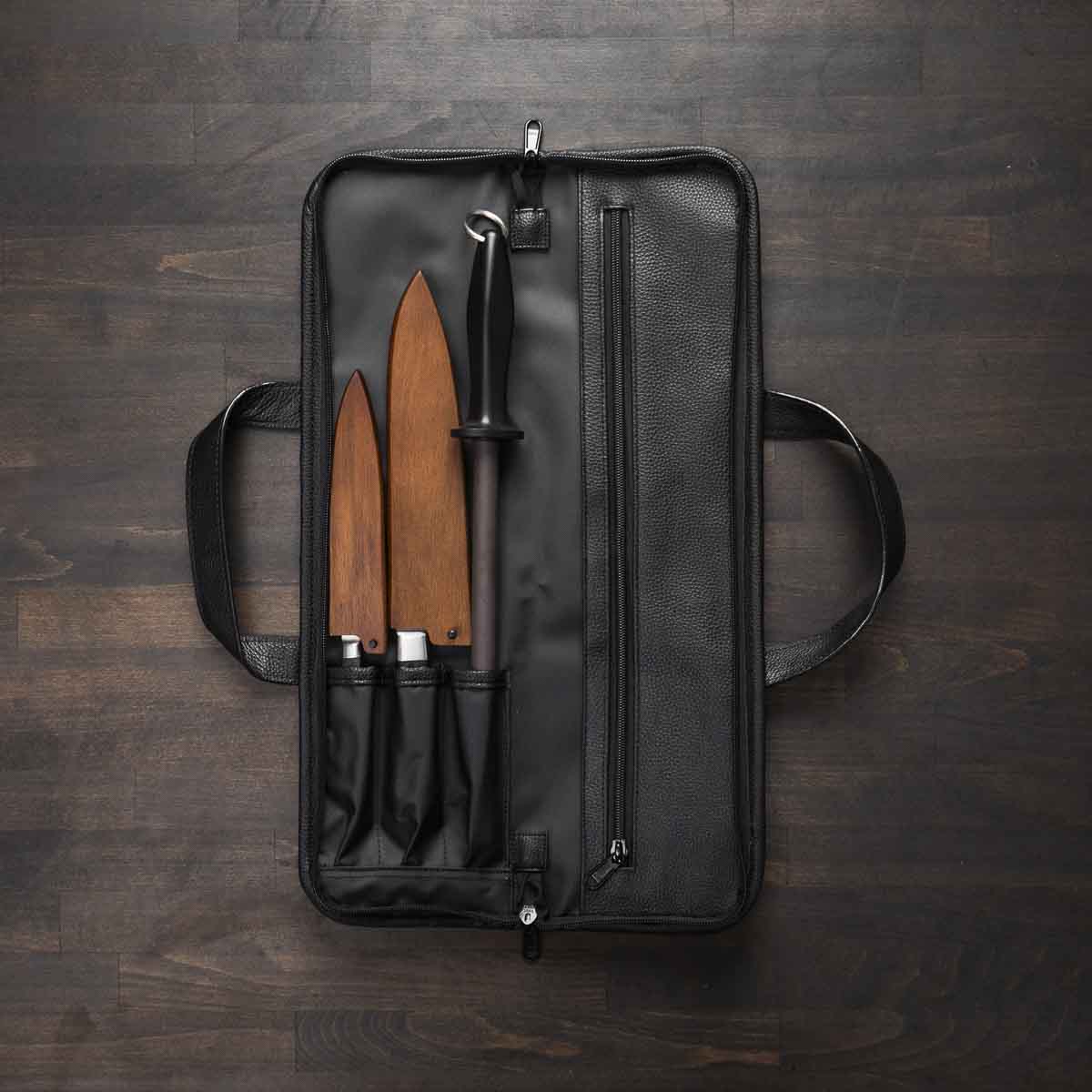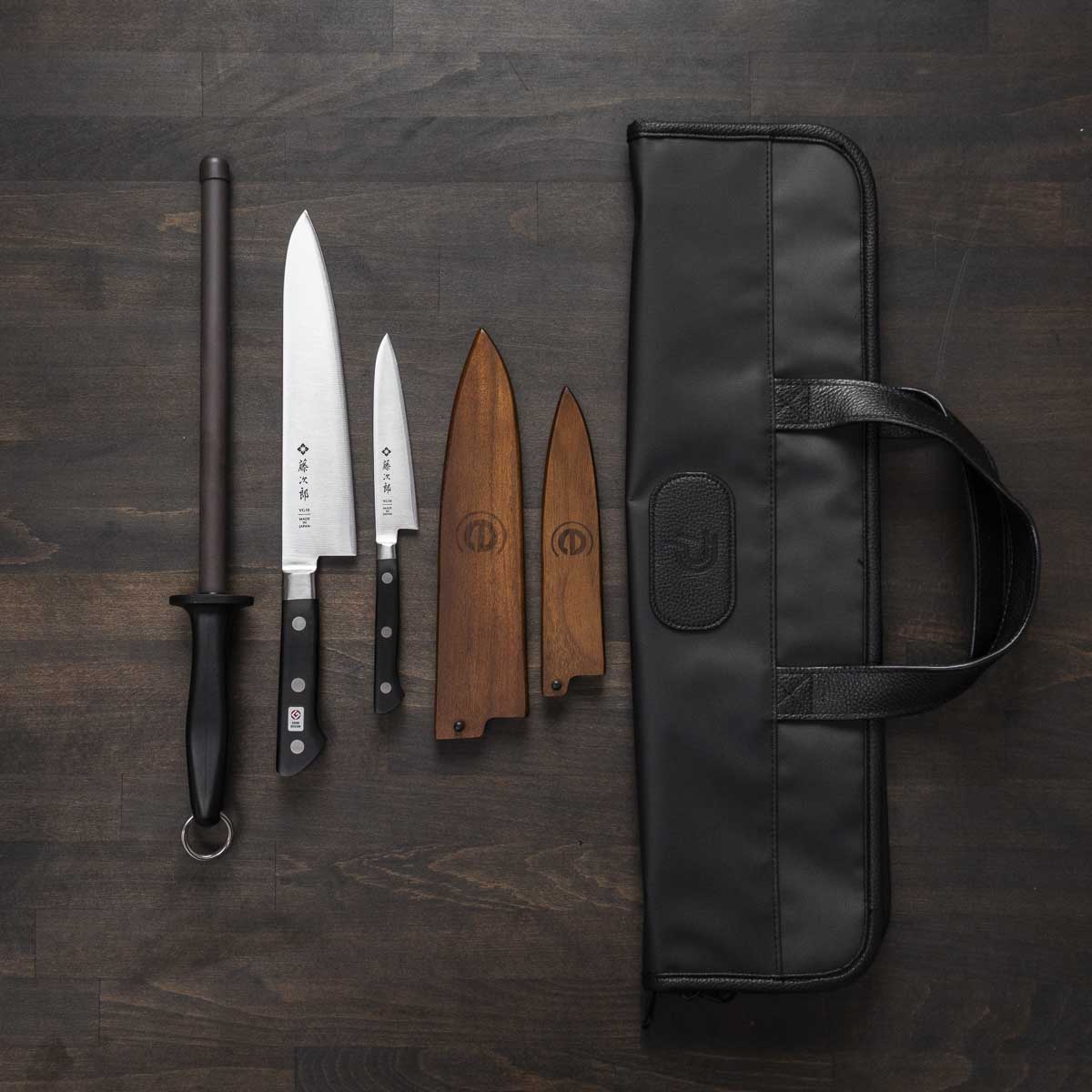Bundle contains Gyuto 210mm, Petty 120m, Wooden Saya x 2, Honing Rod & Porter 3 Pocket Knife Bag