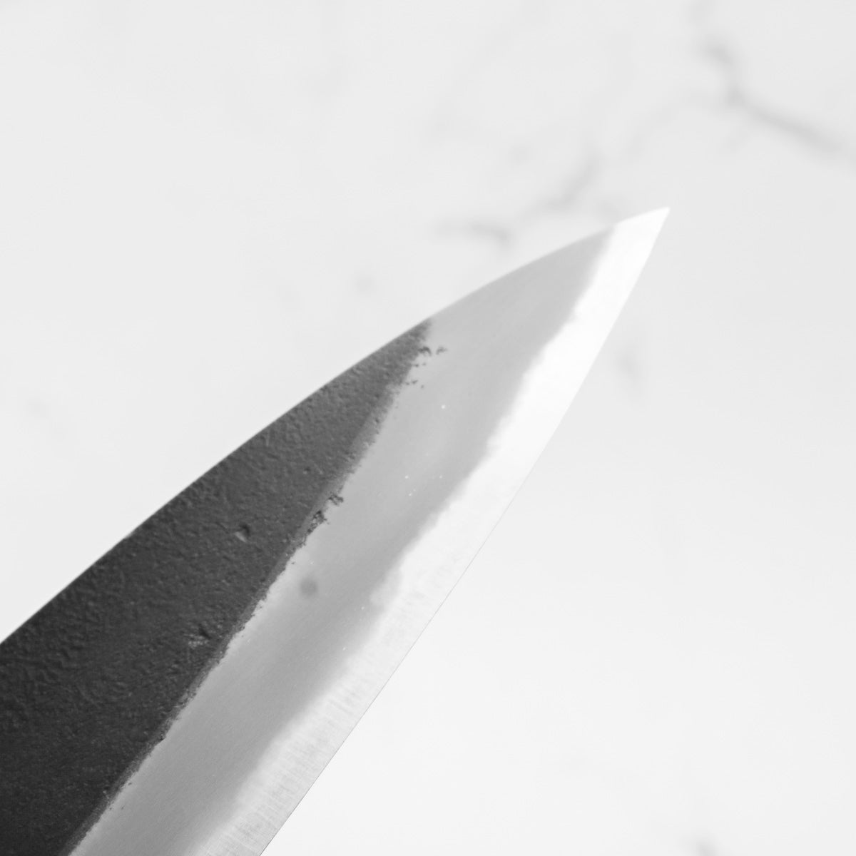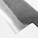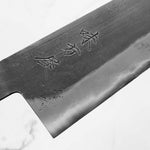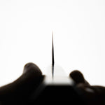 Japanese White Steel #2, a traditional high-carbon steel, is cherished for its purity and fine grain structure, enabling razor-sharp edges, at the cost of being reactive. It is one of the easiest steels to sharpen, but cannot be left wet for even short periods otherwise rust spots can occur. If you’re fastidious in your knife maintenance, this knife steel can be extremely rewarding to use.