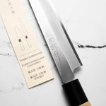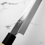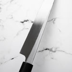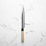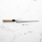 The Yanagiba knife, a staple in traditional Japanese cuisine, is a slender, long-bladed knife primarily used for slicing sashimi and sushi. Its graceful, single-beveled edge guarantees precise, thin cuts, preserving the texture and integrity of the fish. Revered for its sharpness and balance, the Yanagiba is essential for authentic Japanese food preparation.