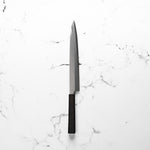 The Yanagiba knife, a staple in traditional Japanese cuisine, is a slender, long-bladed knife primarily used for slicing sashimi and sushi. Its graceful, single-beveled edge guarantees precise, thin cuts, preserving the texture and integrity of the fish. Revered for its sharpness and balance, the Yanagiba is essential for authentic Japanese food preparation.