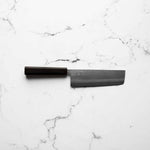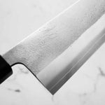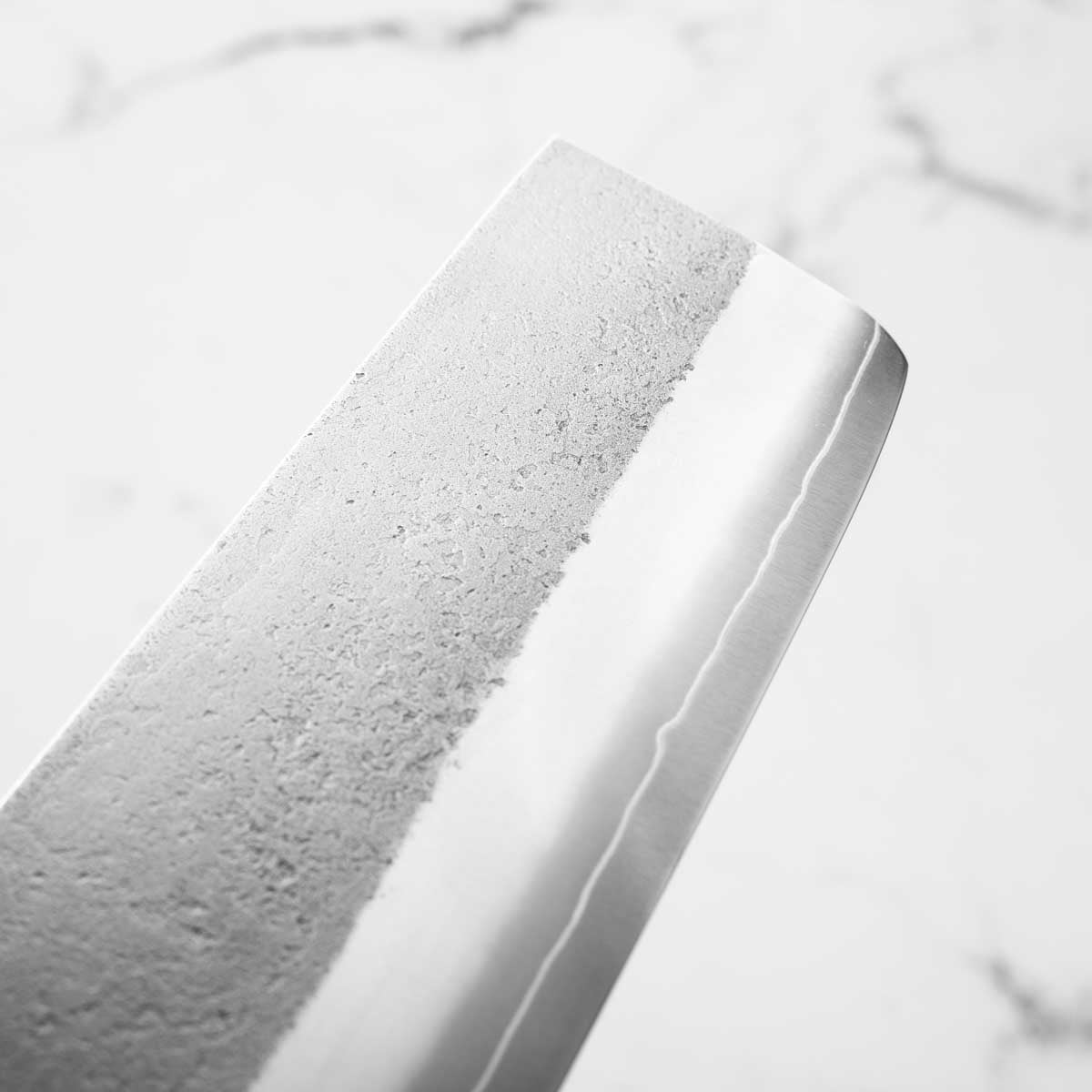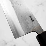 One of their most celebrated offerings is the SKD steel series — featuring a semi-stainless high-carbon core clad in stainless steel. The blades showcase a distinctive wide-bevel grind with a shallow hammer texture that sits stylistically between nashiji and kurouchi finishes. Paired with traditional burnt chestnut handles, each knife reflects Yoshikane’s dedication to consistency, craftsmanship, and timeless design.