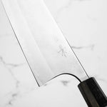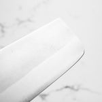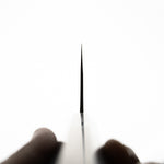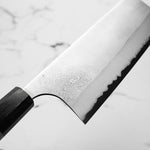 Japanese White Steel #2, a traditional high-carbon steel, is cherished for its purity and fine grain structure, enabling razor-sharp edges, at the cost of being reactive. It is one of the easiest steels to sharpen, but cannot be left wet for even short periods otherwise rust spots can occur. If you’re fastidious in your knife maintenance, this knife steel can be extremely rewarding to use.