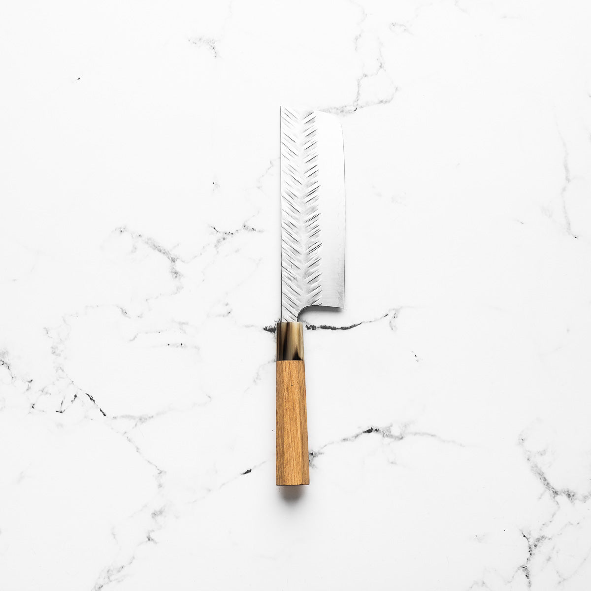 The Nakiri knife, revered in Japanese culinary traditions, is engineered for exceptional vegetable cutting. Featuring a distinct, straight-edged, and rectangular blade, it excels in creating uniform, precise cuts and aesthetic presentation. Its technical design ensures efficiency and precision, making it a valuable tool for both professional chefs and home cooks.