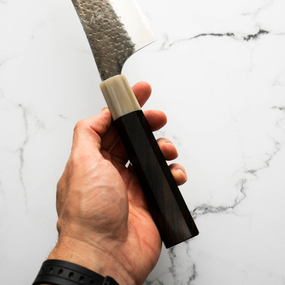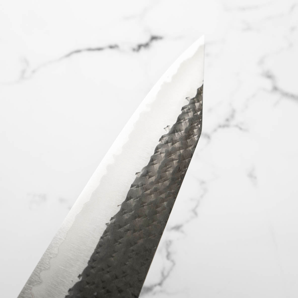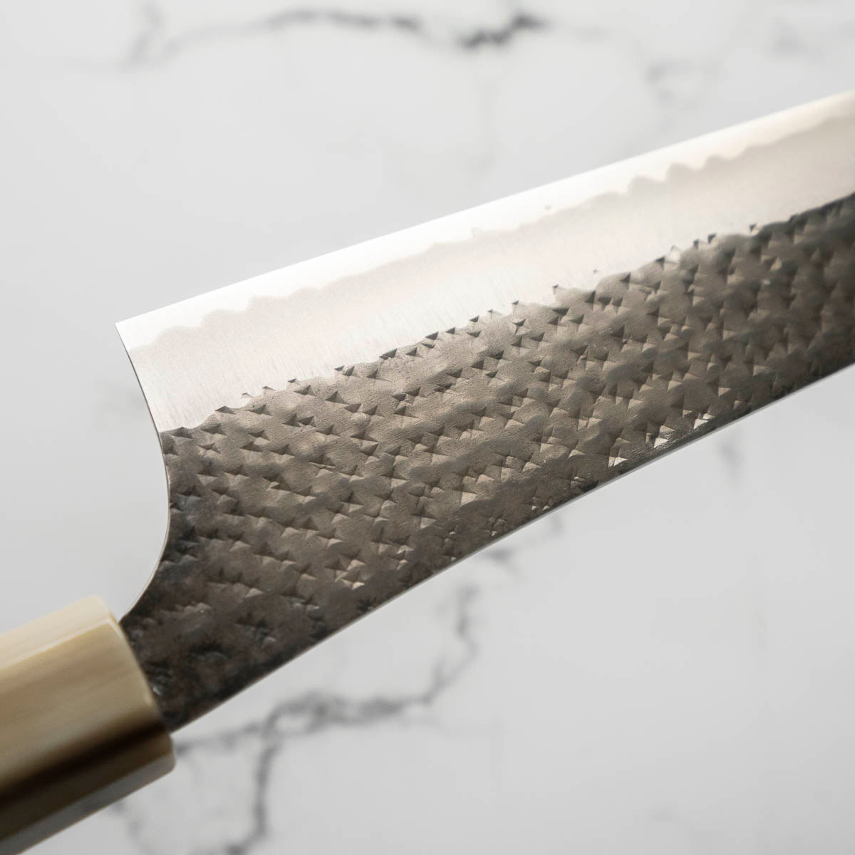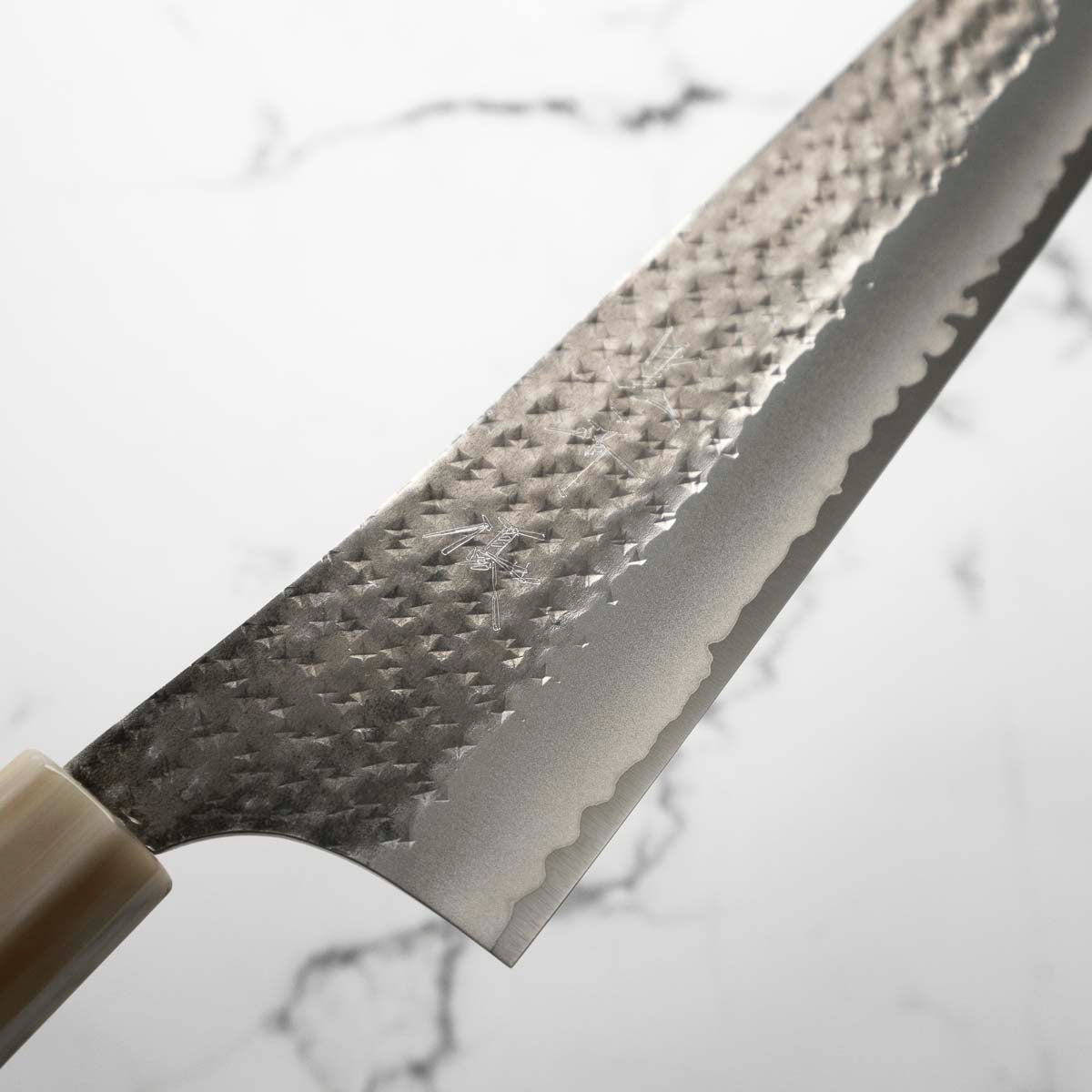His knives are instantly recognizable for their striking Tsuchime and Suminagashi finishes, thin grinds, and use of high-performance steels such as SG2, HAP40, and stainless-clad Blue Super. Kurosaki’s Fujin series, with its dramatic wind-patterned hammer finish, helped cement his reputation as a blacksmith who blends artistry and technical brilliance in equal measure.