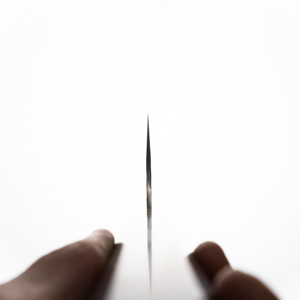 This knife is made from a high-carbon steel and as such, will require a little more care than a regular off-the-shelf knife. It must be dried shortly after use, as prolonged exposure to moisture can cause rust spots to appear. A very light coat of oil during storage also helps to prevent rust spots. A patina (colouration and seasoning of the steel) will occur with use.