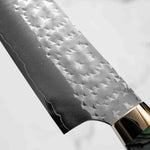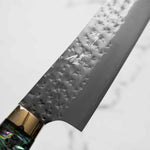 His knives are instantly recognizable for their striking Tsuchime and Suminagashi finishes, thin grinds, and use of high-performance steels such as SG2, HAP40, and stainless-clad Blue Super. Kurosaki’s Fujin series, with its dramatic wind-patterned hammer finish, helped cement his reputation as a blacksmith who blends artistry and technical brilliance in equal measure.