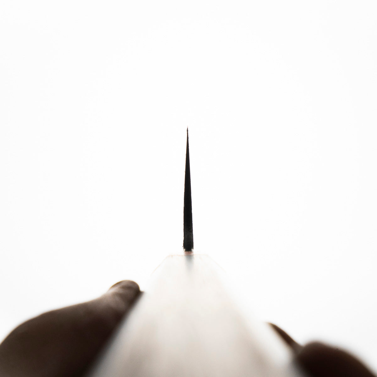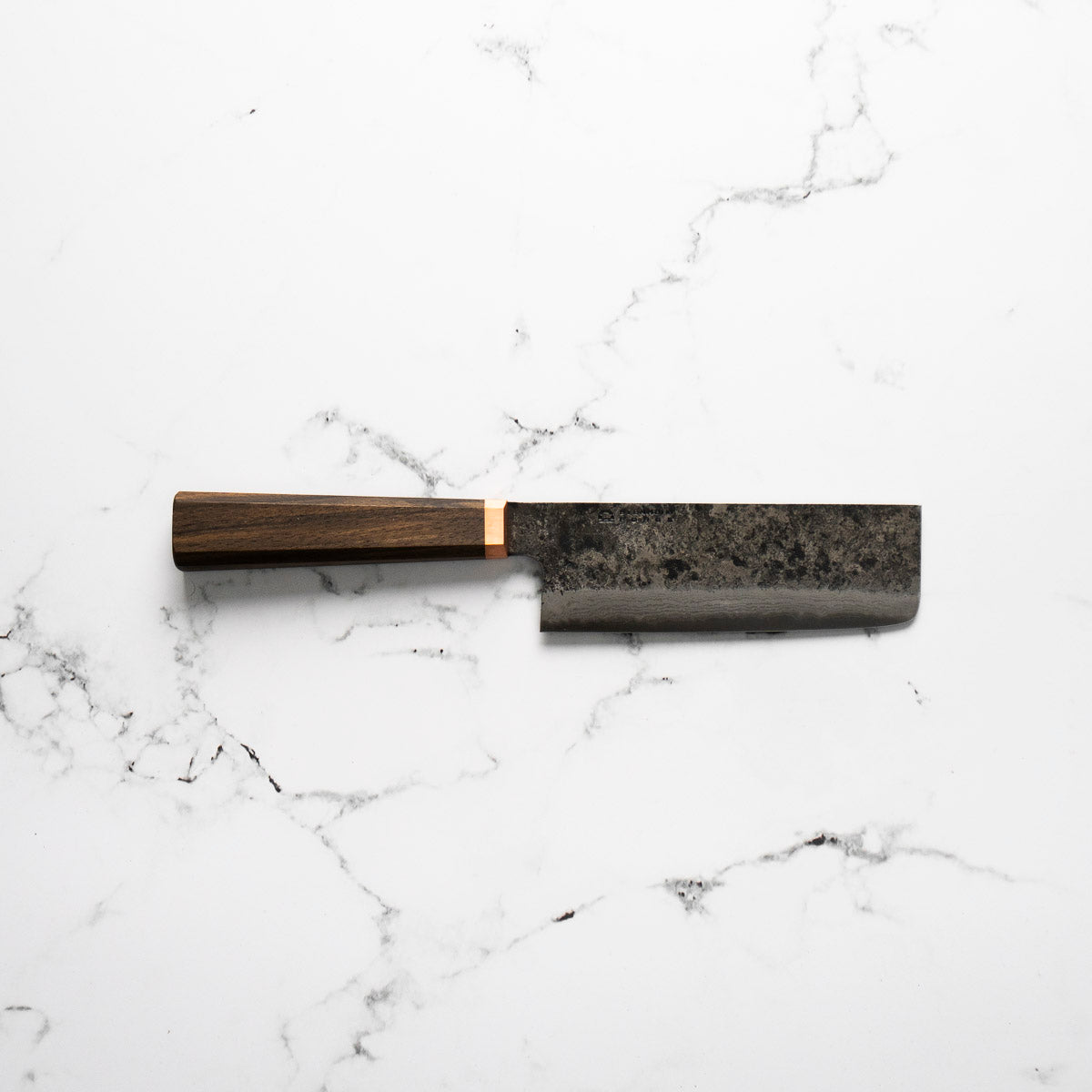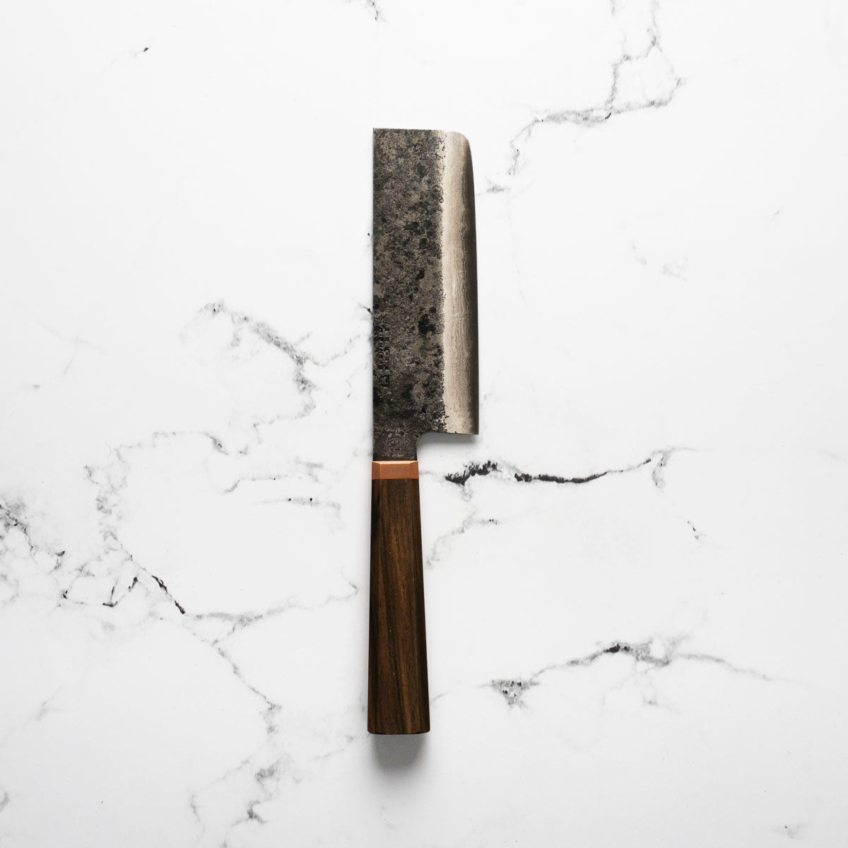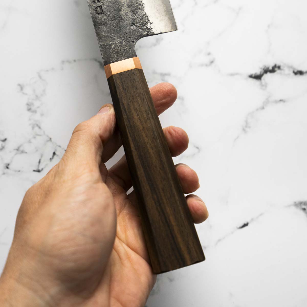 This knife is made from a high-carbon steel and as such, will require a little more care than a regular off-the-shelf knife. It must be dried shortly after use, as prolonged exposure to moisture can cause rust spots to appear. A very light coat of oil during storage also helps to prevent rust spots. A patina (colouration and seasoning of the steel) will occur with use.