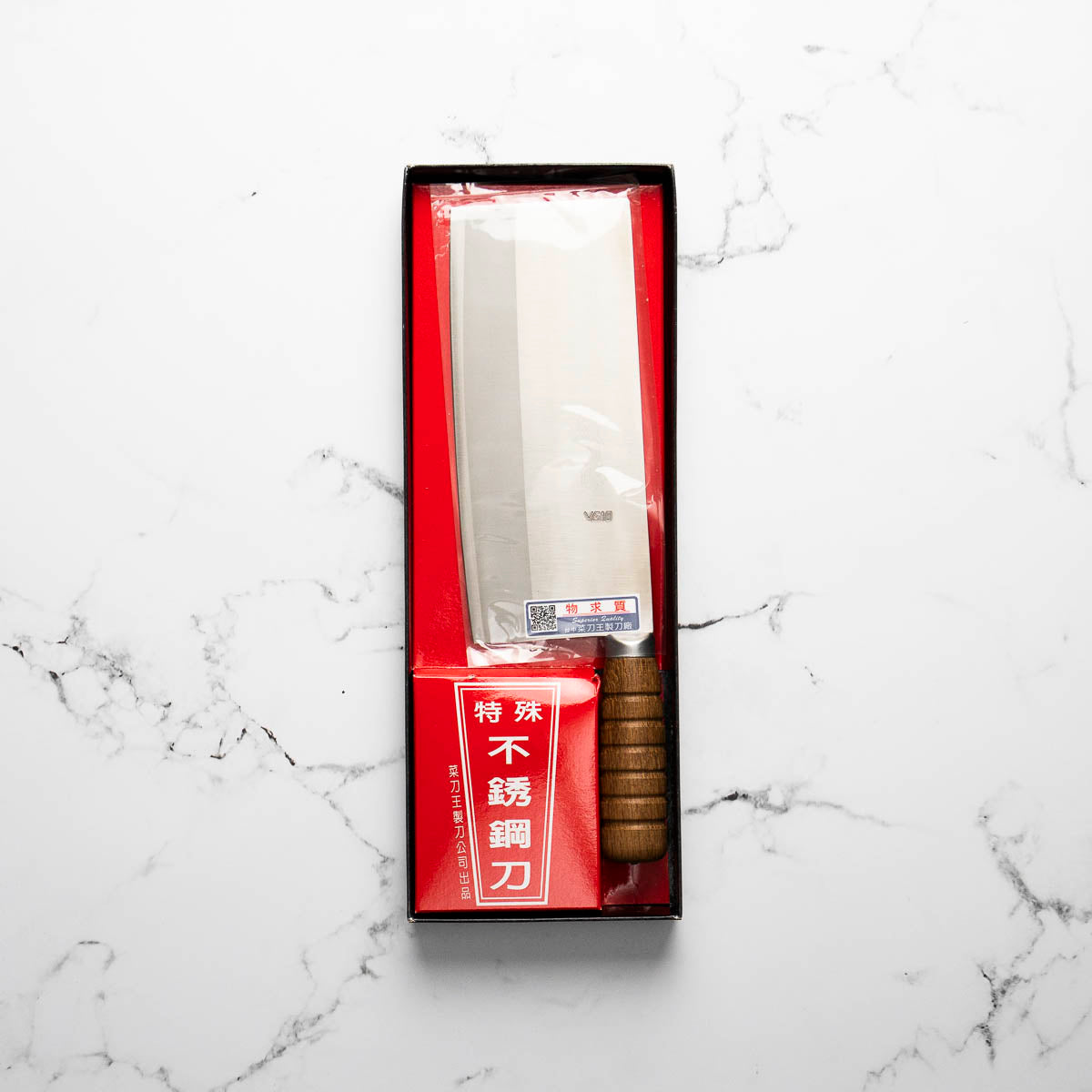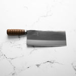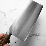 The cleaver, distinct from its Western counterpart, is a specialized tool designed for precision meat cutting. It features a robust, wide blade adept at slicing through large cuts of meat and bones with ease and efficiency.