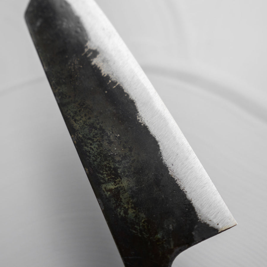 This knife is made from a high-carbon steel and as such, will require a little more care than a regular off-the-shelf knife. It must be dried shortly after use, as prolonged exposure to moisture can cause rust spots to appear. A very light coat of oil during storage also helps to prevent rust spots. A patina (colouration and seasoning of the steel) will occur with use.