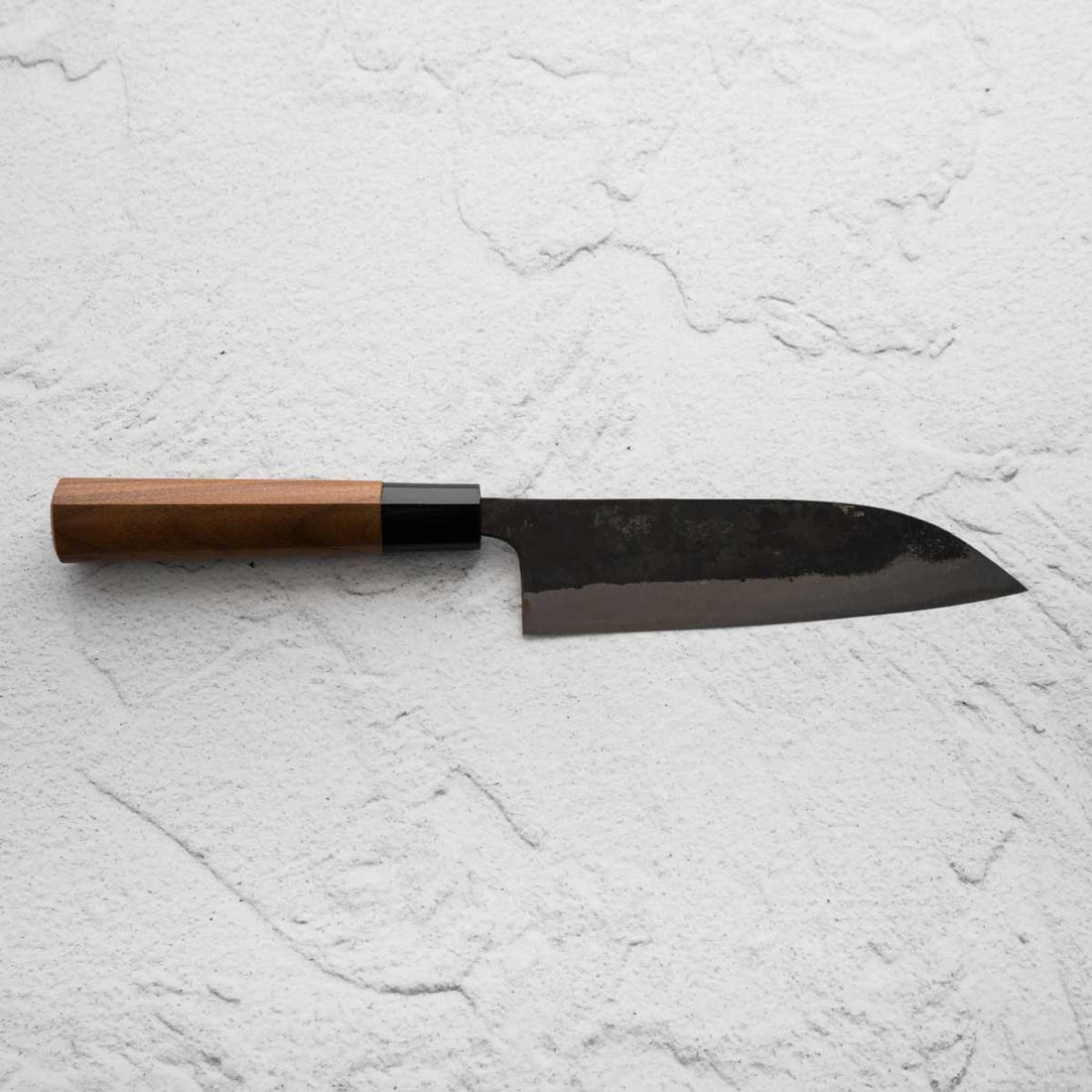This knife is made from a high-carbon steel and as such, will require a little more care than a regular off-the-shelf knife. It must be dried shortly after use, as prolonged exposure to moisture can cause rust spots to appear. A very light coat of oil during storage also helps to prevent rust spots. A patina (colouration and seasoning of the steel) will occur with use.