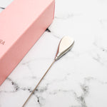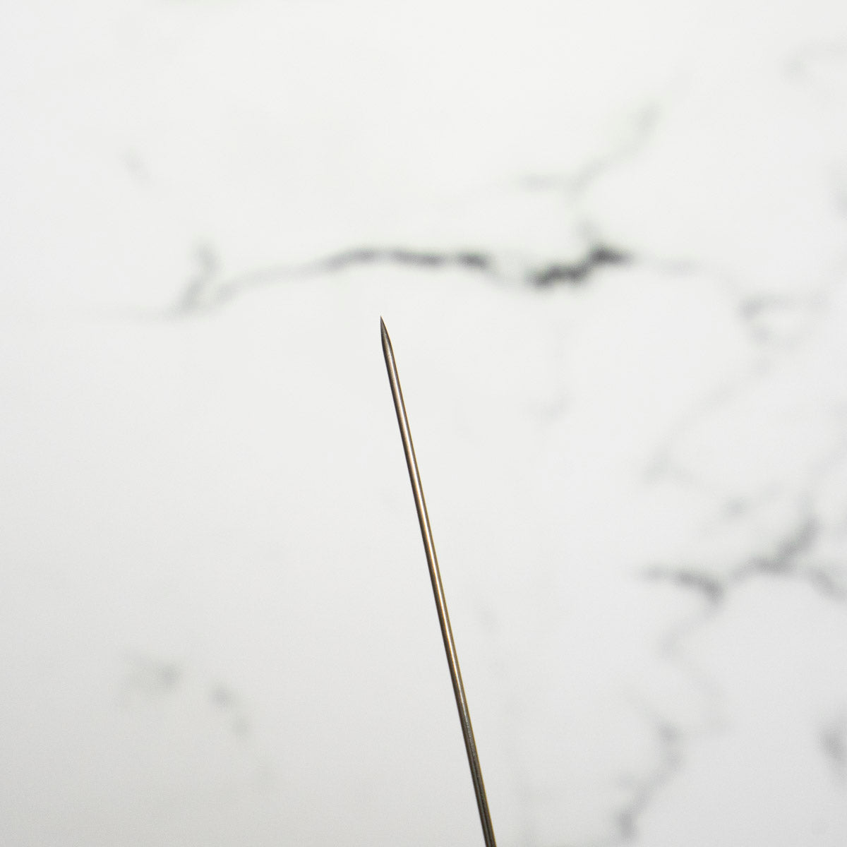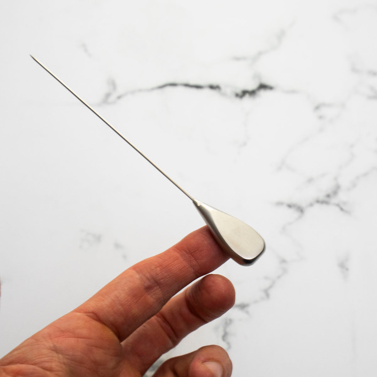 A cake tester that doesn’t melt, snap, or separate. Noyau is built with tough Japanese steel, a more fitting material than the polyurethane often used by manufacturers. Taking inspiration from cocktail pins found at bars and antique shops in Kyoto, Noyau's head is stamped flat to feel like a weighted guitar pick, and pinched at the base to keep the rod firmly in place. The tip is pointed, to mimic a toothpick and slide through meat, fish, cake, and veg without damaging flesh, fiber, or crumb.