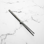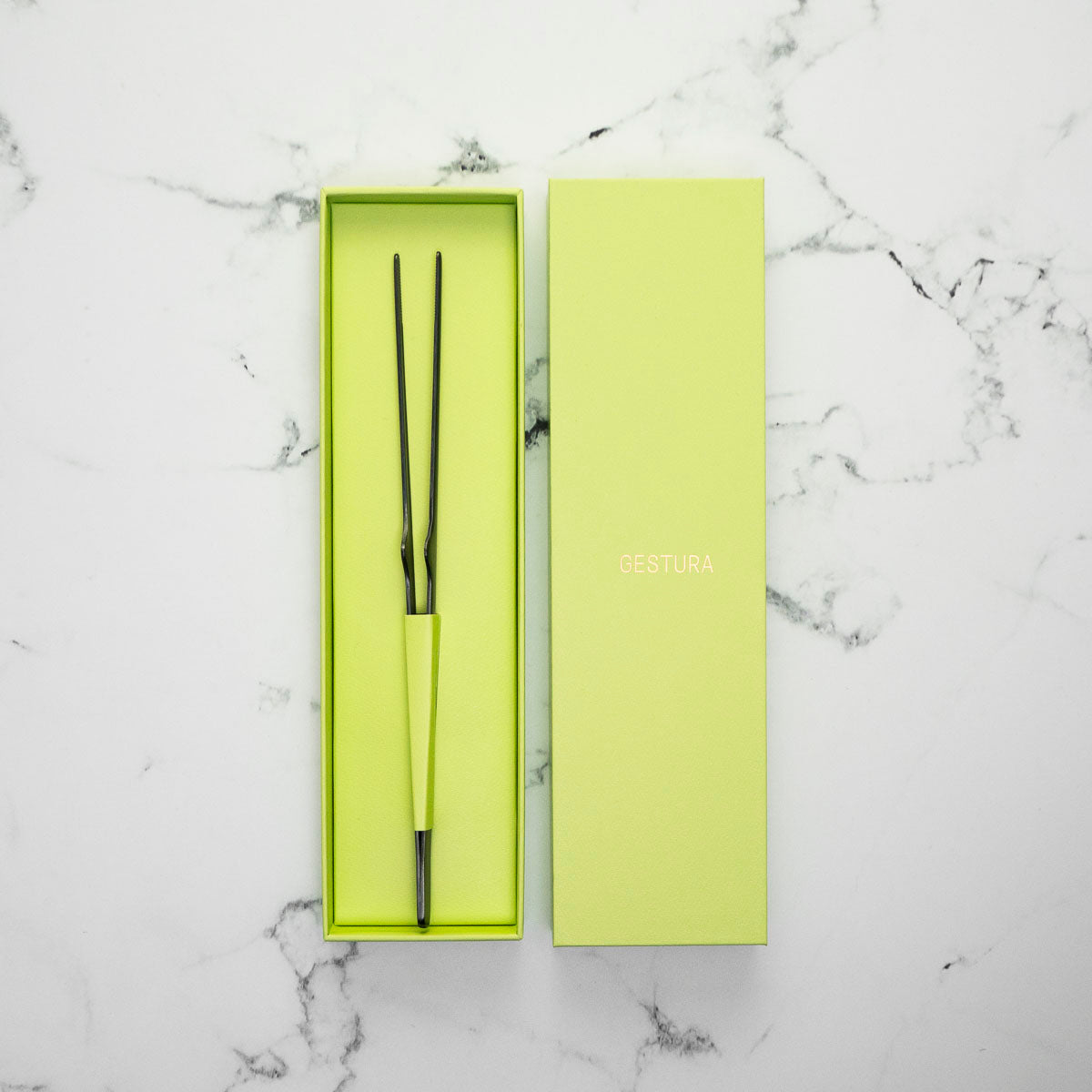 Stando combines the long tapered profile of Japanese cooking chopsticks with the tension and precision of plating tweezers. It is comfortable everywhere from turning small veg in a small pan, to handling noodles and grilling.