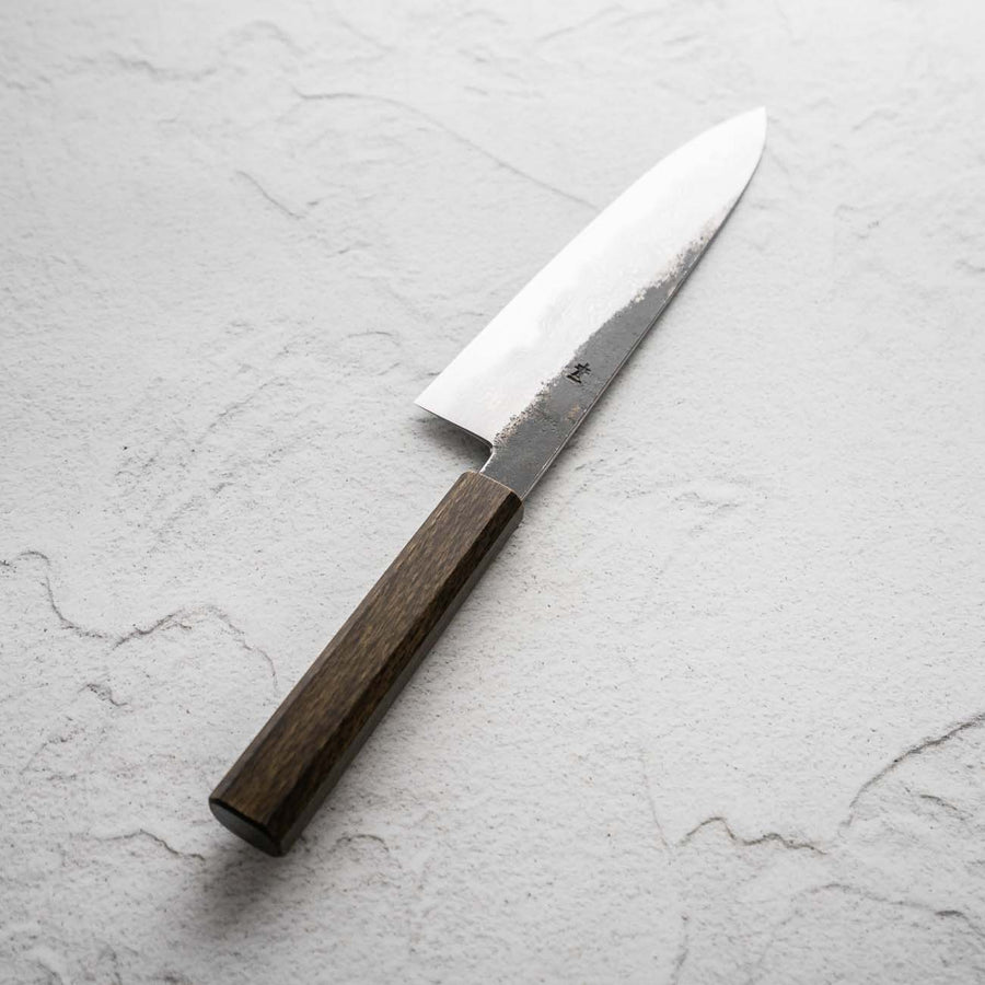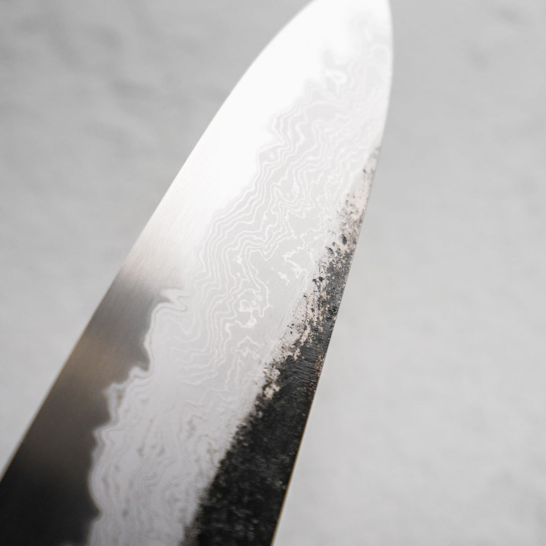 This knife is made from a high-carbon steel and as such, will require a little more care than a regular off-the-shelf knife. It must be dried shortly after use, as prolonged exposure to moisture can cause rust spots to appear. A very light coat of oil during storage also helps to prevent rust spots. A patina (colouration and seasoning of the steel) will occur with use.
