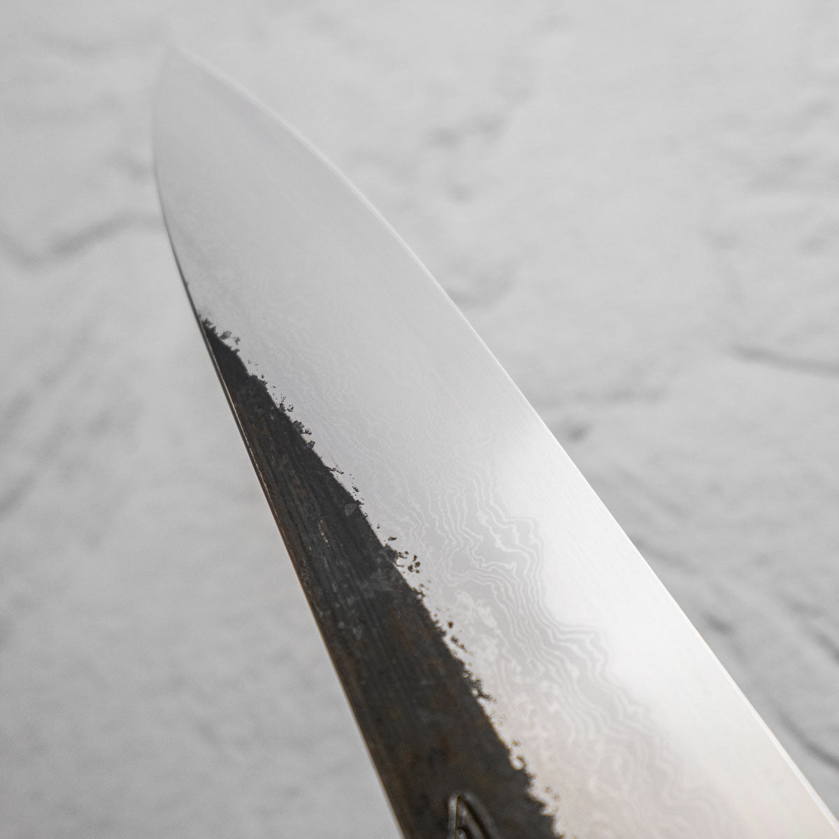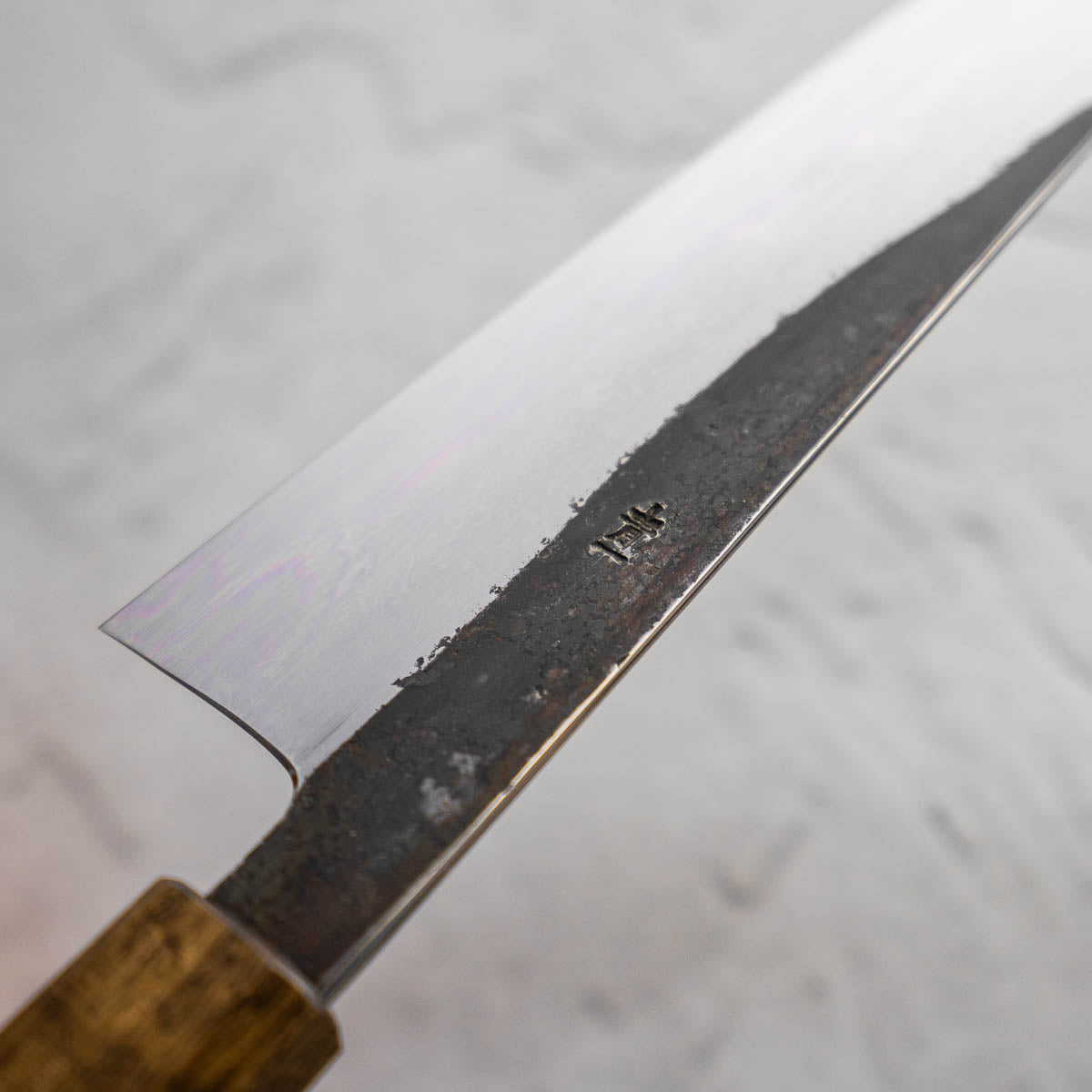 This knife is made from a high-carbon steel and as such, will require a little more care than a regular off-the-shelf knife. It must be dried shortly after use, as prolonged exposure to moisture can cause rust spots to appear. A very light coat of oil during storage also helps to prevent rust spots. A patina (colouration and seasoning of the steel) will occur with use.