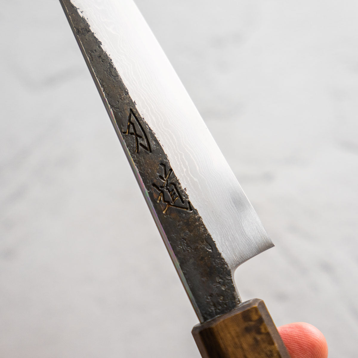 This knife is made from a high-carbon steel and as such, will require a little more care than a regular off-the-shelf knife. It must be dried shortly after use, as prolonged exposure to moisture can cause rust spots to appear. A very light coat of oil during storage also helps to prevent rust spots. A patina (colouration and seasoning of the steel) will occur with use.