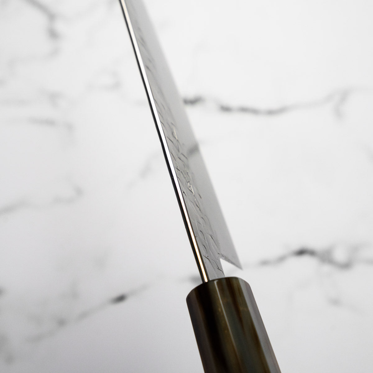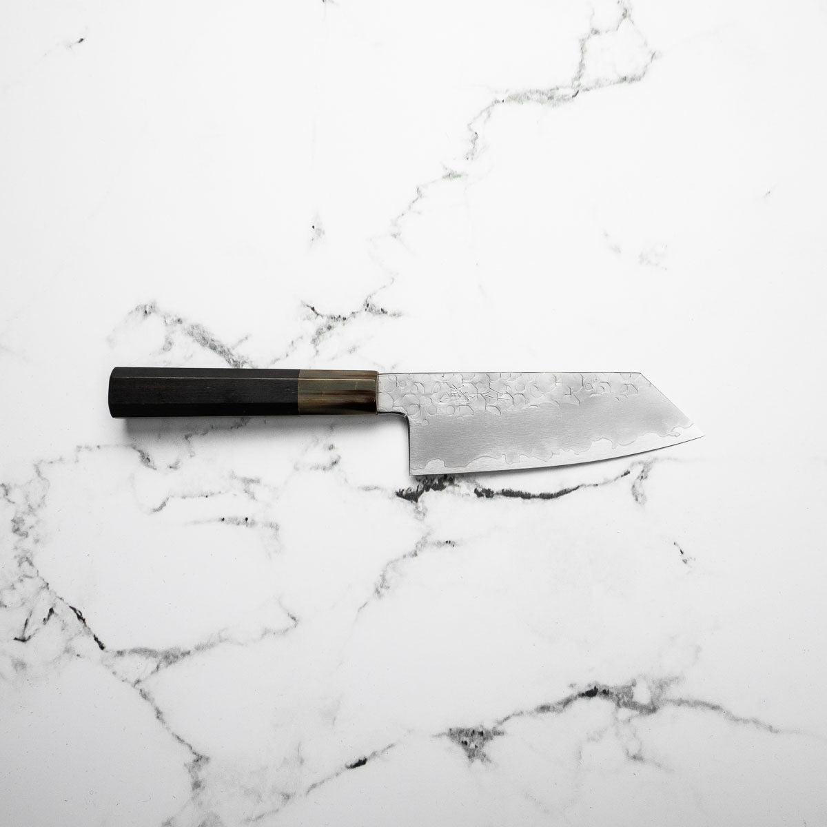 This knife is made from a high-carbon steel and as such, will require a little more care than a regular off-the-shelf knife. It must be dried shortly after use, as prolonged exposure to moisture can cause rust spots to appear. A very light coat of oil during storage also helps to prevent rust spots. A patina (colouration and seasoning of the steel) will occur with use.