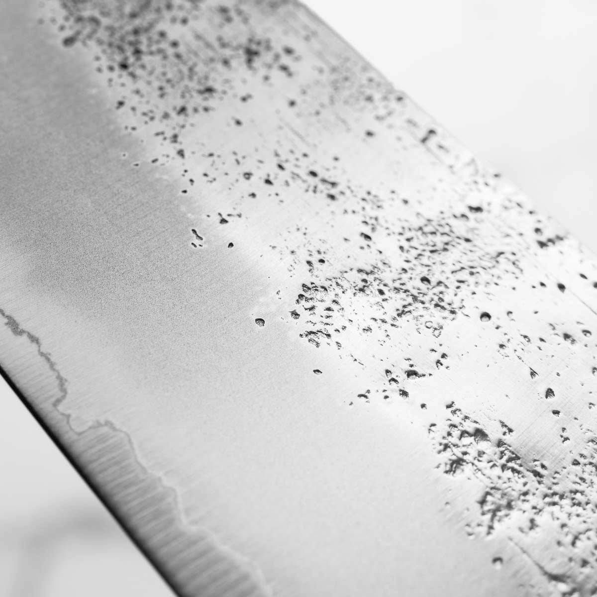 This knife is made with stainless steel and is easy going and low on maintenance. It has high chromium content, meaning it is generally considered safe to leave wet on the board for short periods of time. is still best practice to not leave this knife to air dry as it's stain-less not stain-none! Wipe down after washing the knife and store away from any sources of moisture.