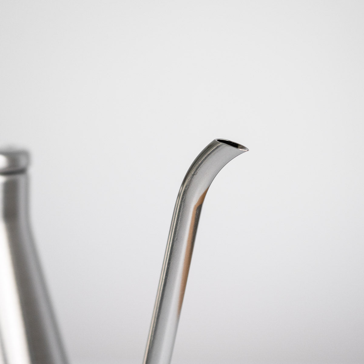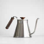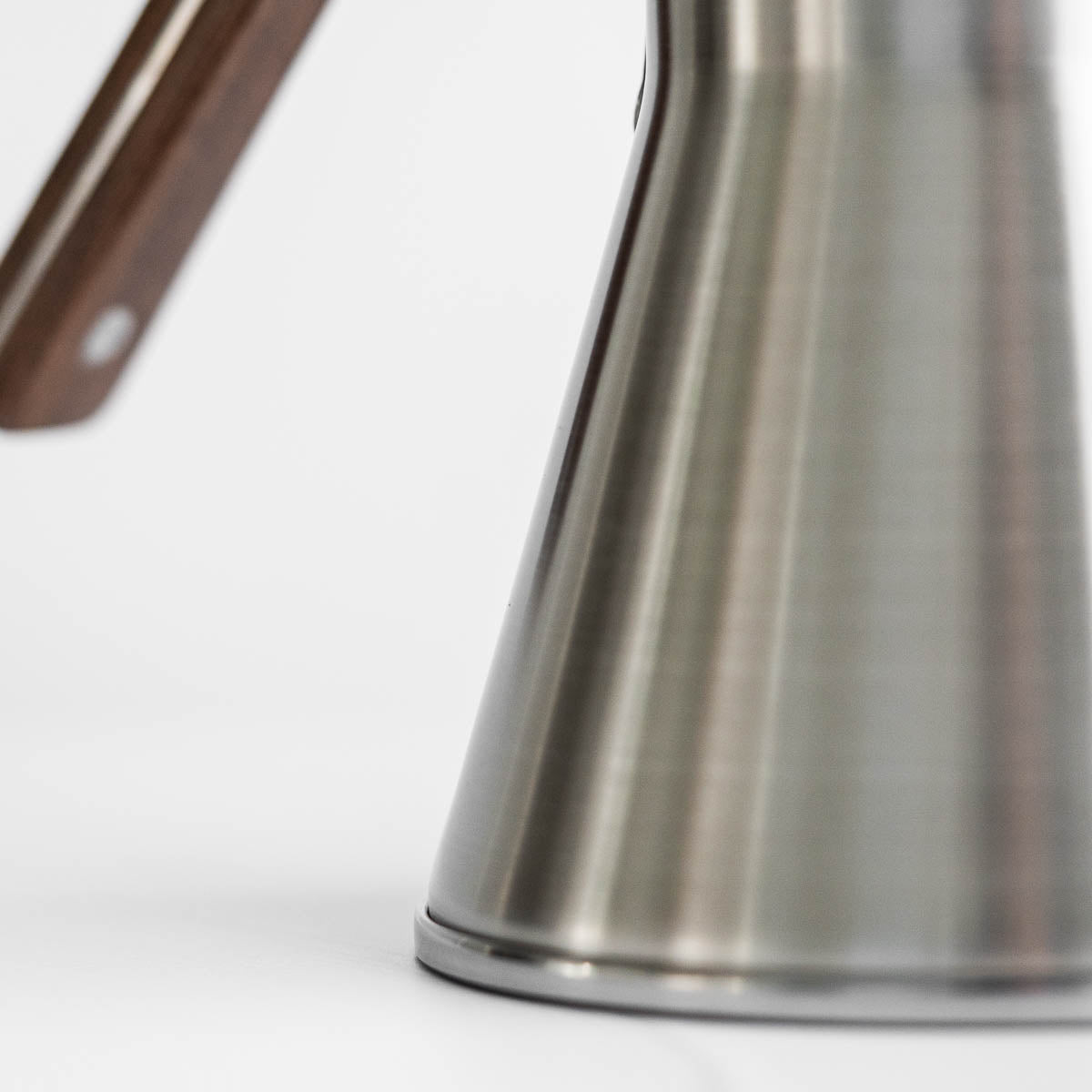 Ideas for an easy-to-pour kettle are realized in the spout shape and the wooden handle that fits comfortably in one hand.