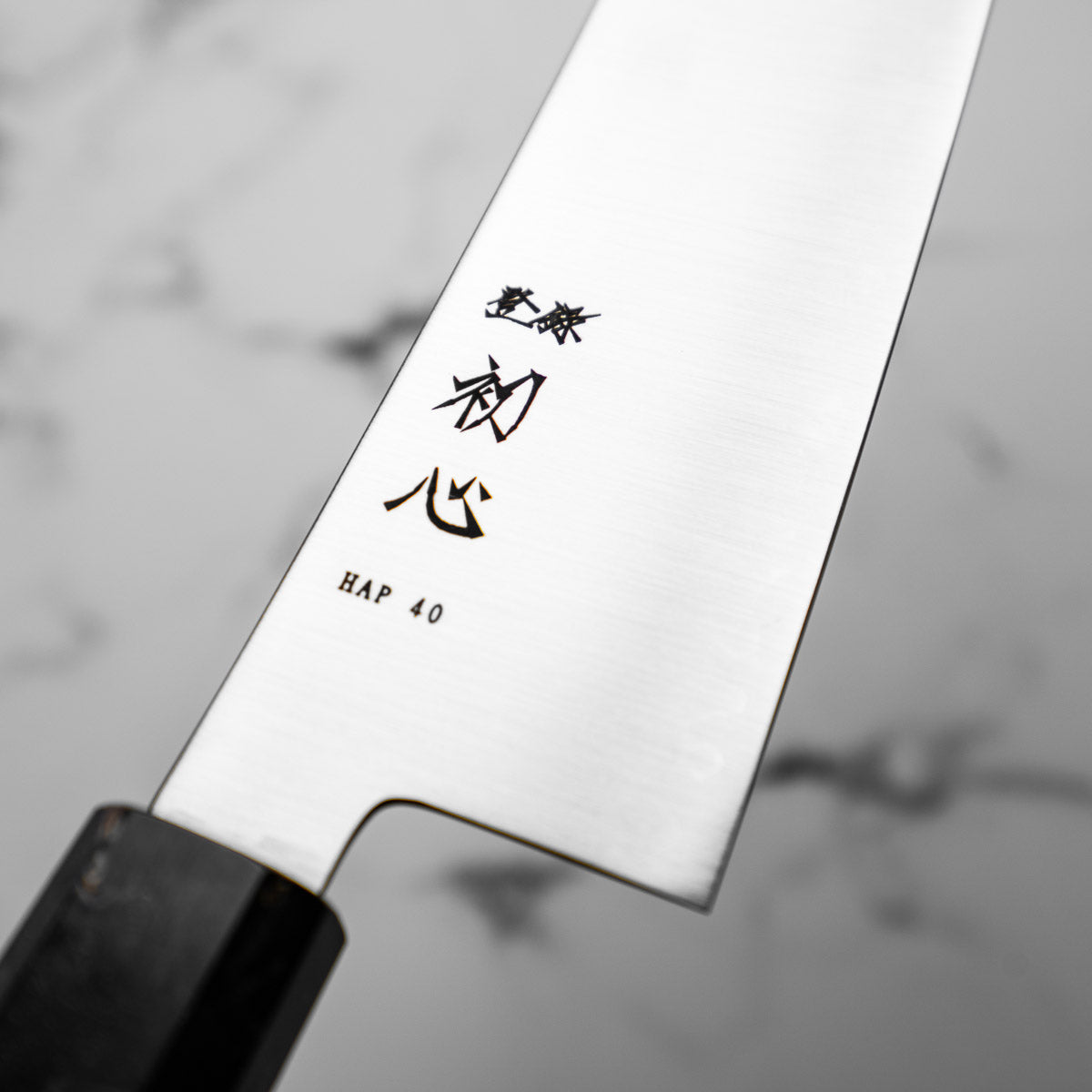 HAP40 is an extremely hard (often HRC65) powder semi-stainless steel by Hitachi Metals in Japan. It holds an edge for an extremely long time and will develop a patina with use. It has enough chromium content to ward off rust spots if left wet for short periods, but best to be kept dry after use. It can be tricky to sharpen without a coarse stone of around 500 grit to get the burr moving.