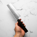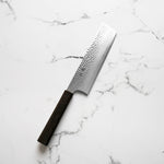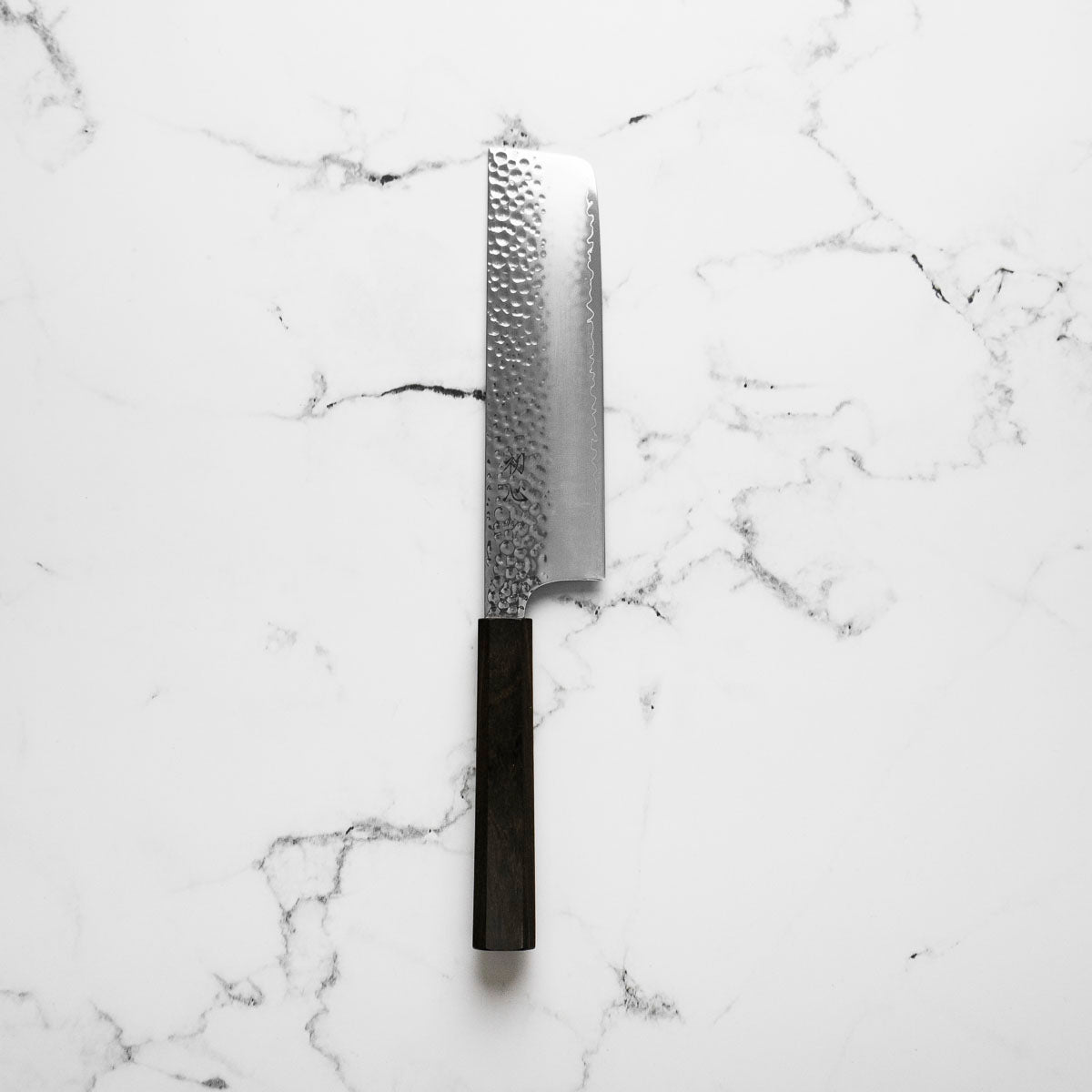 The Nakiri knife, revered in Japanese culinary traditions, is engineered for exceptional vegetable cutting. Featuring a distinct, straight-edged, and rectangular blade, it excels in creating uniform, precise cuts and aesthetic presentation. Its technical design ensures efficiency and precision, making it a valuable tool for both professional chefs and home cooks.