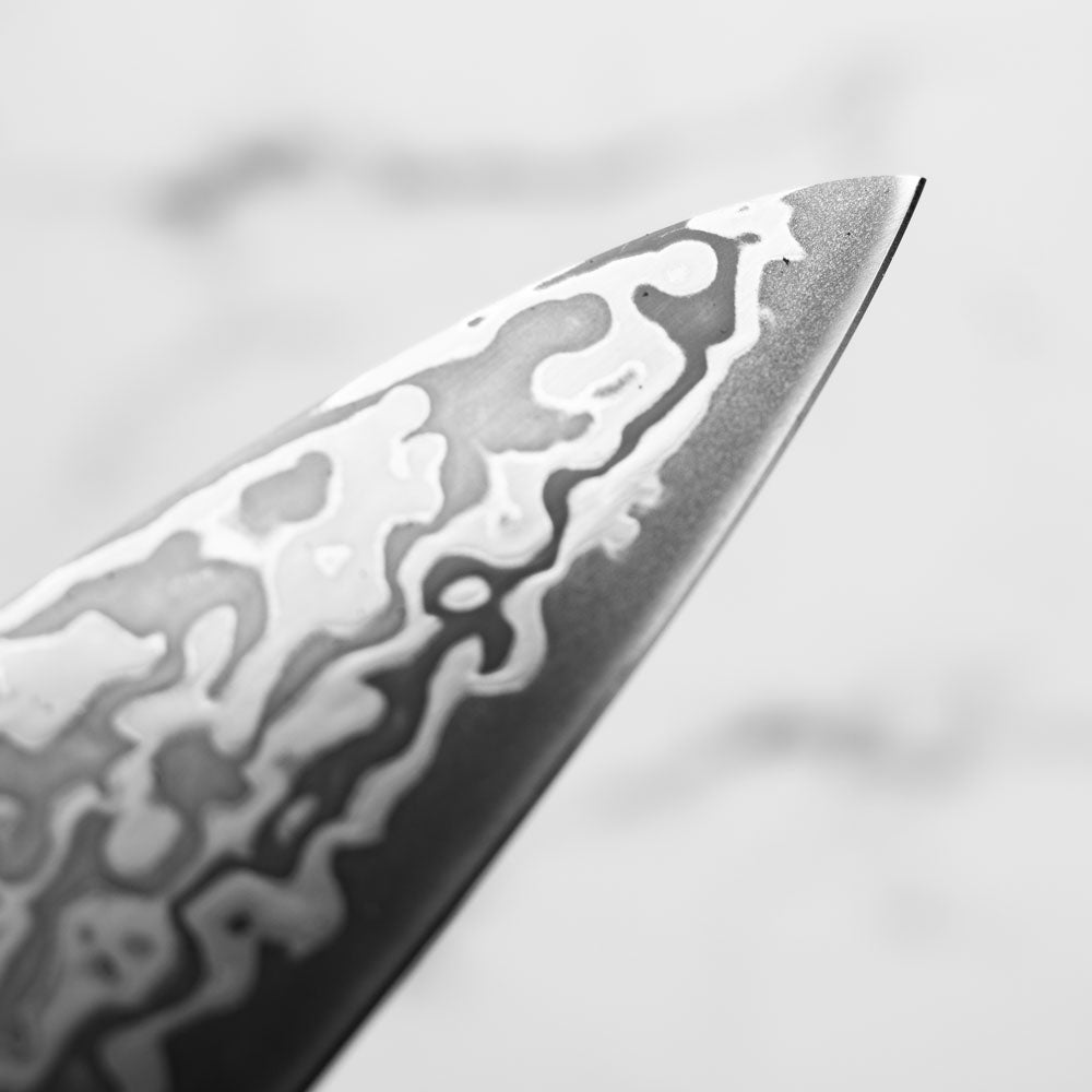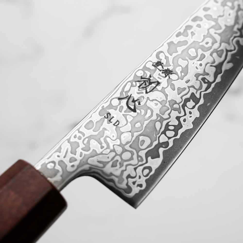 Japanese SLD steel is a semi-stainless steel crafted through advanced metallurgy. It is used often in Sanjo knives, has a non-chippy edge and is extremely tough. This high-carbon steel, enriched with chromium and molybdenum, offers excellent performance, but be mindful not to leave it wet for extended periods.