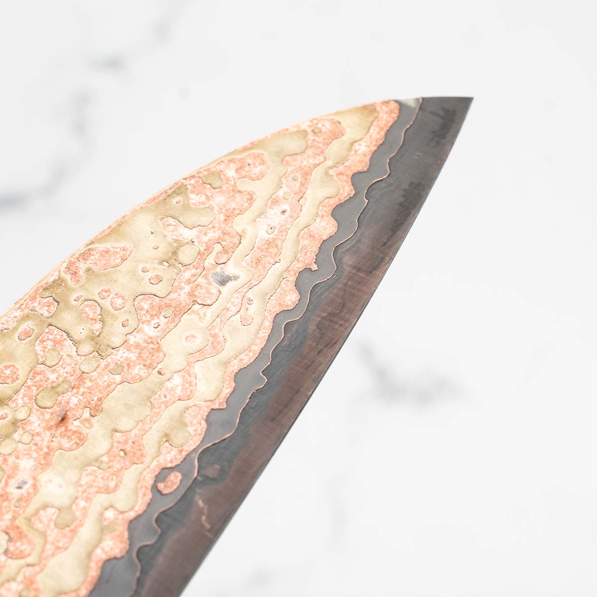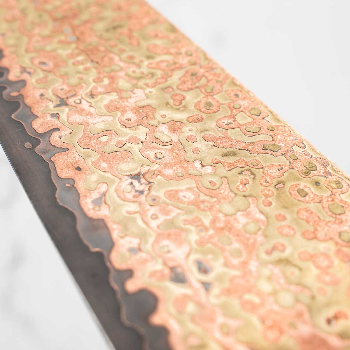 This knife is made from a high-carbon steel and as such, will require a little more care than a regular off-the-shelf knife. It must be dried shortly after use, as prolonged exposure to moisture can cause rust spots to appear. A very light coat of oil during storage also helps to prevent rust spots. A patina (colouration and seasoning of the steel) will occur with use.