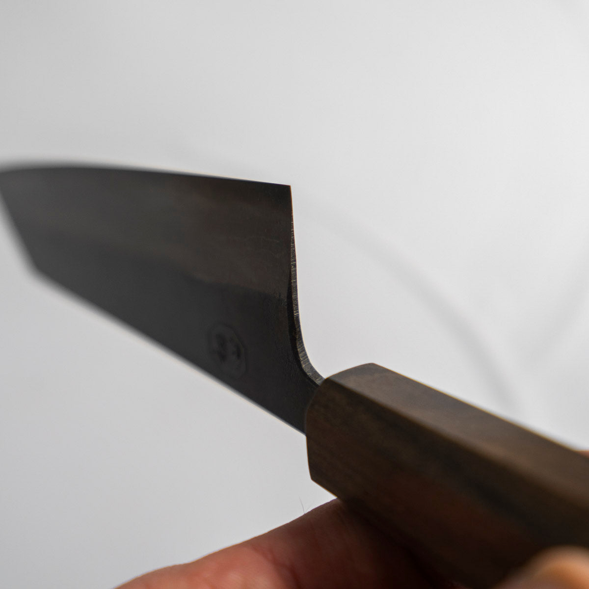 This knife is made from a high-carbon steel and as such, will require a little more care than a regular off-the-shelf knife. It must be dried shortly after use, as prolonged exposure to moisture can cause rust spots to appear. A very light coat of oil during storage also helps to prevent rust spots. A patina (colouration and seasoning of the steel) will occur with use.