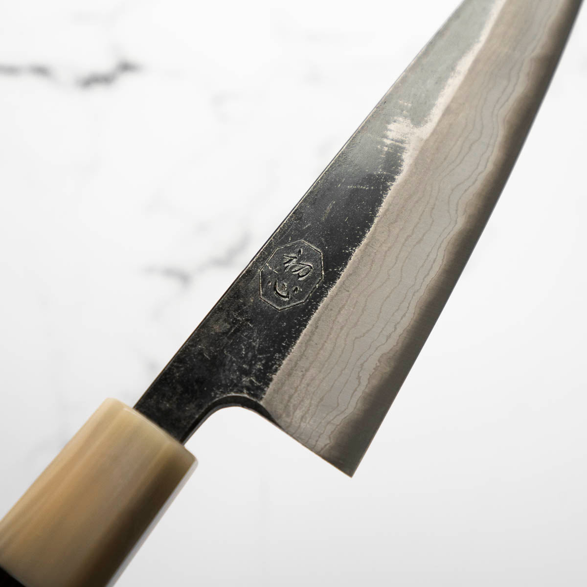 This knife is made from a high-carbon steel and as such, will require a little more care than a regular off-the-shelf knife. It must be dried shortly after use, as prolonged exposure to moisture can cause rust spots to appear. A very light coat of oil during storage also helps to prevent rust spots. A patina (colouration and seasoning of the steel) will occur with use.