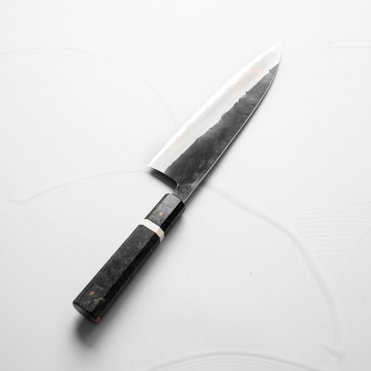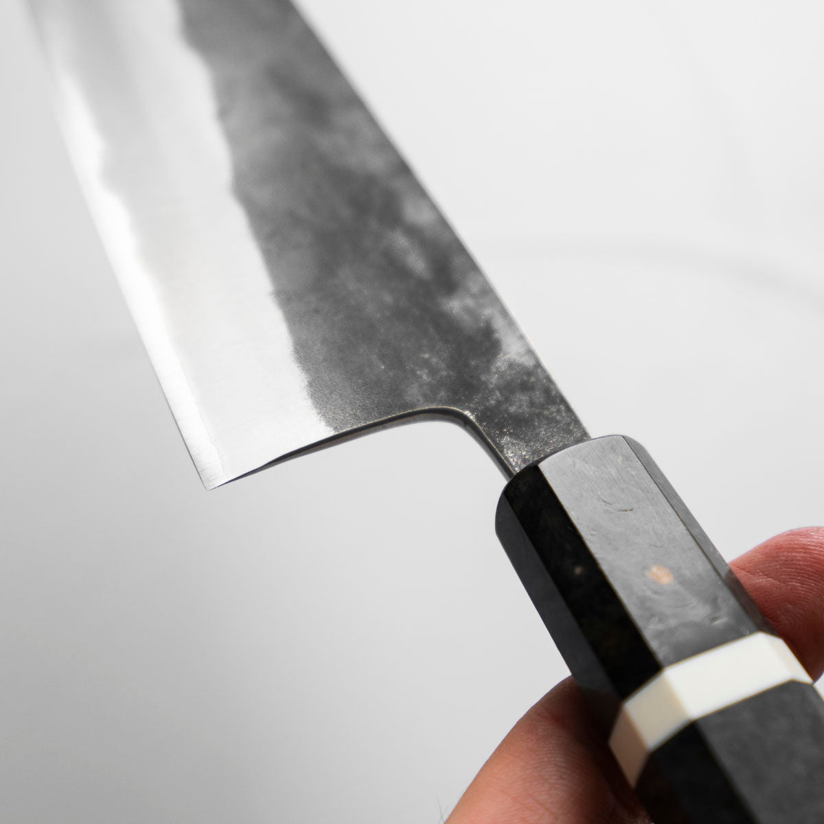 Japanese White Steel #2, a traditional high-carbon steel, is cherished for its purity and fine grain structure, enabling razor-sharp edges, at the cost of being reactive. It is one of the easiest steels to sharpen, but cannot be left wet for even short periods otherwise rust spots can occur. If you’re fastidious in your knife maintenance, this knife steel can be extremely rewarding to use.