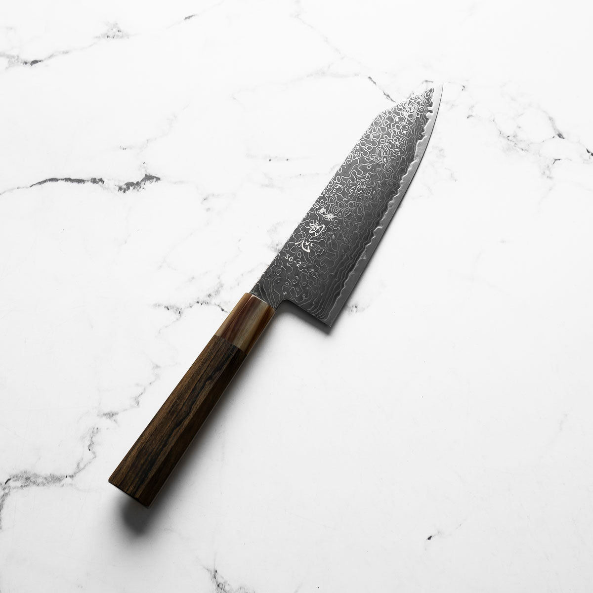 Japanese SG2, also known as R2 steel, is a high-end, powdered metallurgy stainless steel and one of the finest knife-making steels available in Japan. It is a favourite of many for its exceptional hardness and edge retention. Its fine, uniform grain structure enables razor-sharp edges, all the while holding an edge for much longer than Carbon steel knives, without needing to be concerned about rust appearing.