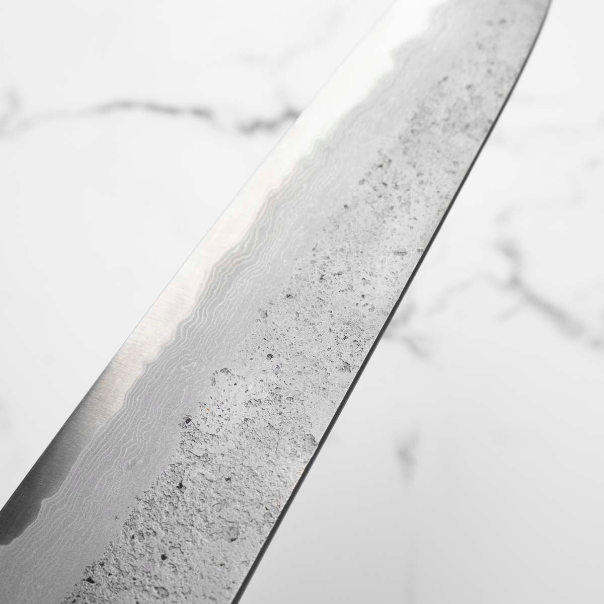 This knife is made from a high-carbon steel and as such, will require a little more care than a regular off-the-shelf knife. It must be dried shortly after use, as prolonged exposure to moisture can cause rust spots to appear. A very light coat of oil during storage also helps to prevent rust spots. A patina (colouration and seasoning of the steel) will occur with use.
