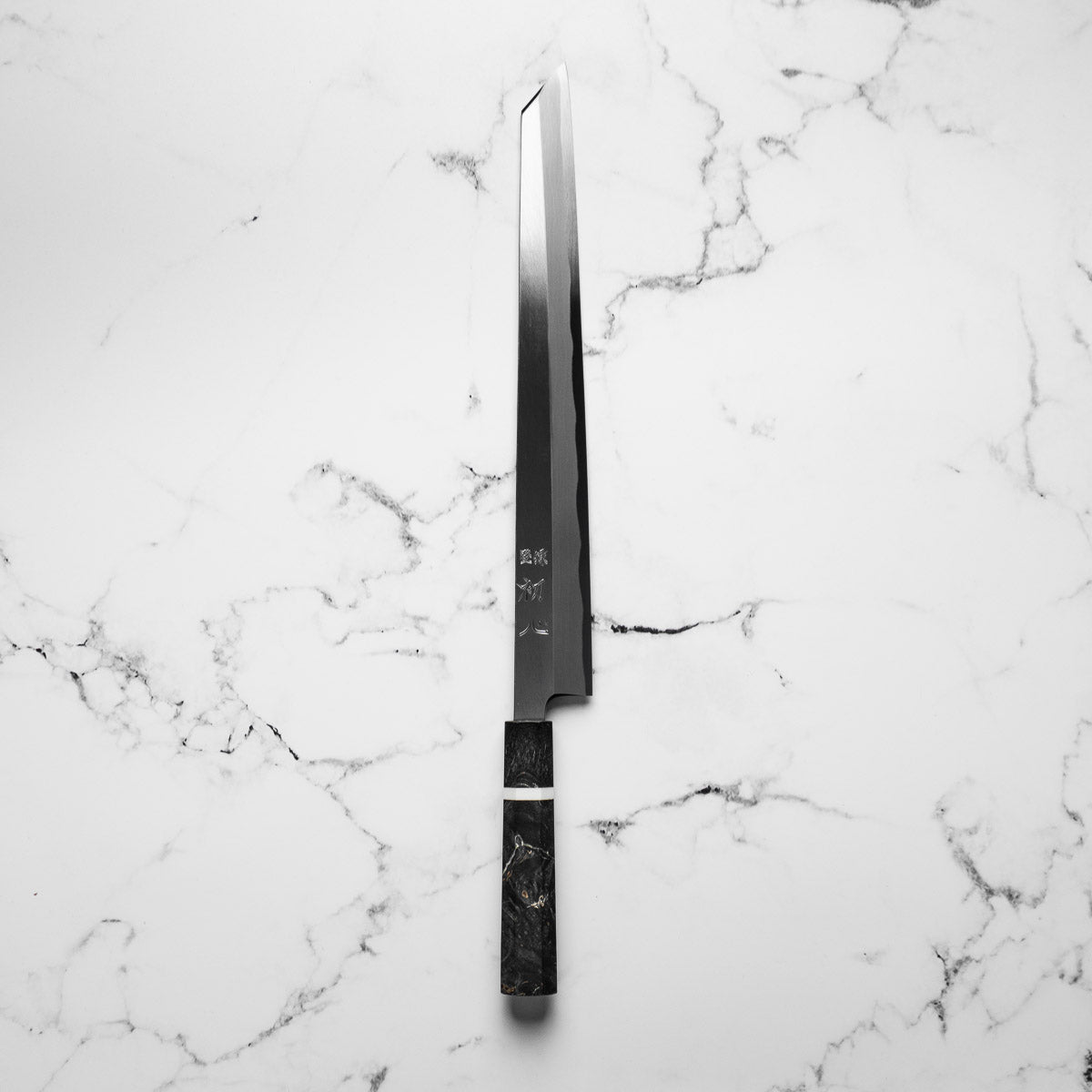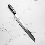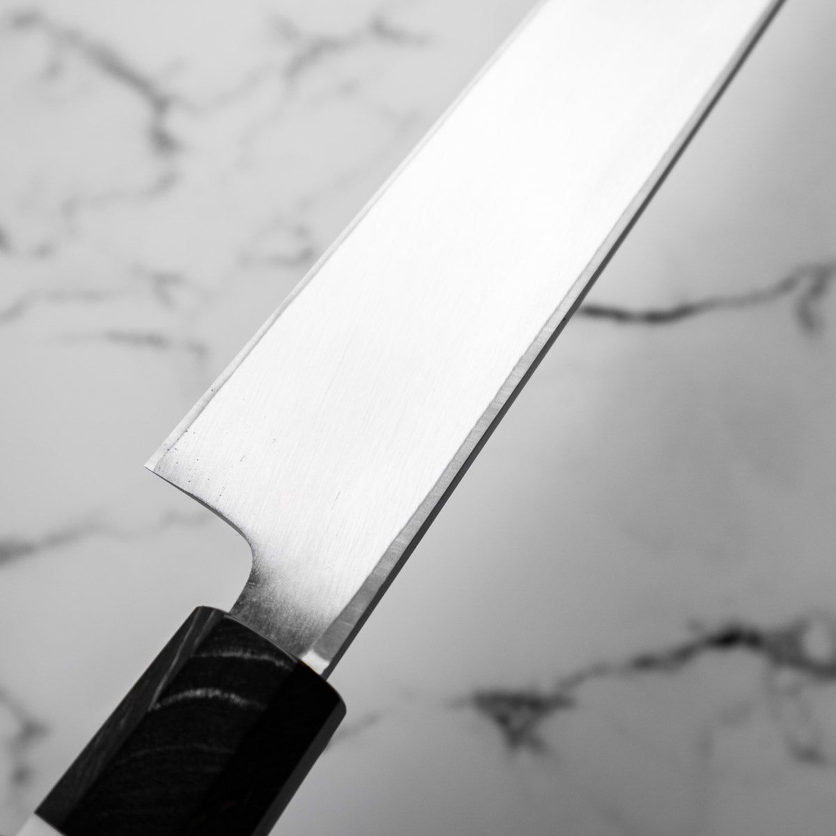 The Yanagiba knife, a staple in traditional Japanese cuisine, is a slender, long-bladed knife primarily used for slicing sashimi and sushi. Its graceful, single-beveled edge guarantees precise, thin cuts, preserving the texture and integrity of the fish. Revered for its sharpness and balance, the Yanagiba is essential for authentic Japanese food preparation.