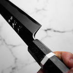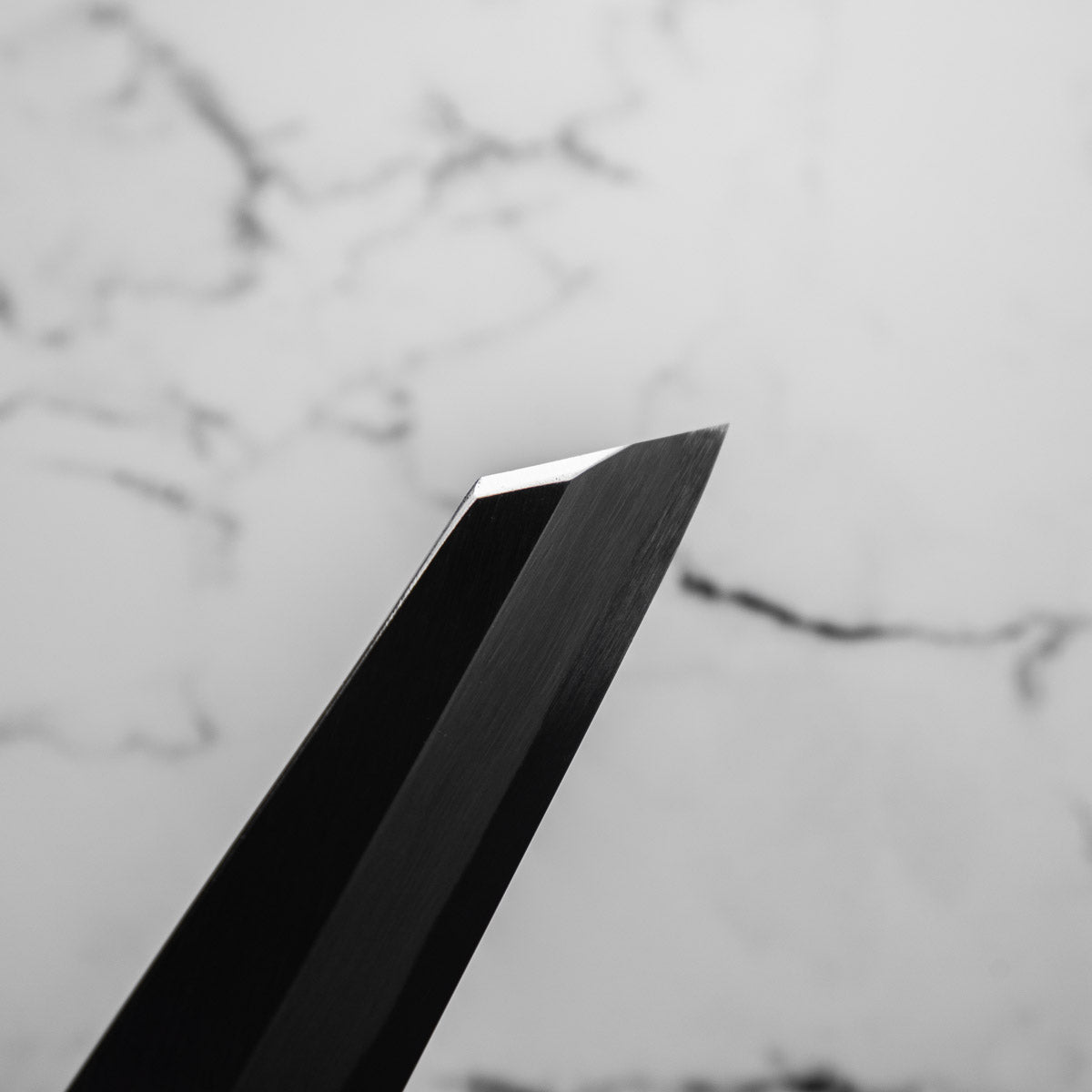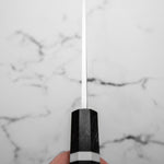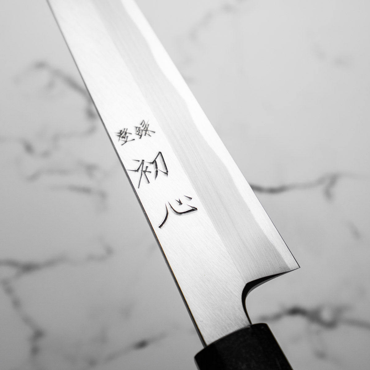 Japanese White Steel #2, a traditional high-carbon steel, is cherished for its purity and fine grain structure, enabling razor-sharp edges, at the cost of being reactive. It is one of the easiest steels to sharpen, but cannot be left wet for even short periods otherwise rust spots can occur. If you’re fastidious in your knife maintenance, this knife steel can be extremely rewarding to use.