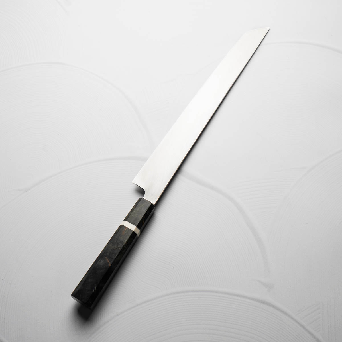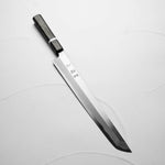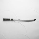 The Yanagiba knife, a staple in traditional Japanese cuisine, is a slender, long-bladed knife primarily used for slicing sashimi and sushi. Its graceful, single-beveled edge guarantees precise, thin cuts, preserving the texture and integrity of the fish. Revered for its sharpness and balance, the Yanagiba is essential for authentic Japanese food preparation.