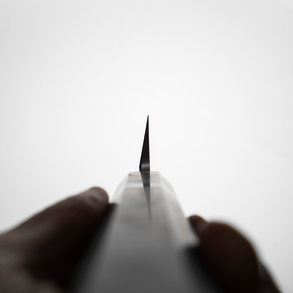 Japanese White Steel #2, a traditional high-carbon steel, is cherished for its purity and fine grain structure, enabling razor-sharp edges, at the cost of being reactive. It is one of the easiest steels to sharpen, but cannot be left wet for even short periods otherwise rust spots can occur. If you’re fastidious in your knife maintenance, this knife steel can be extremely rewarding to use.
