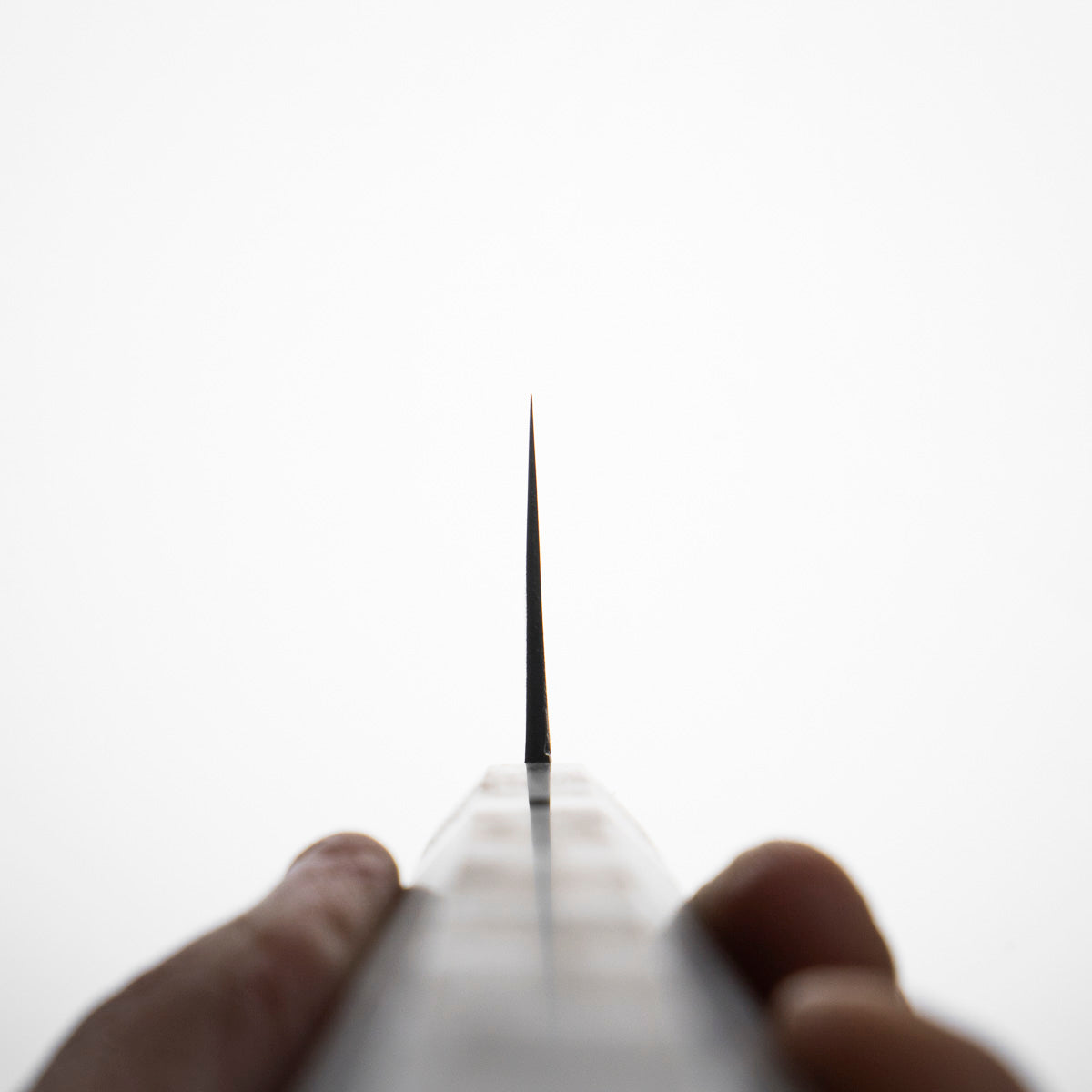 Japanese White Steel #2, a traditional high-carbon steel, is cherished for its purity and fine grain structure, enabling razor-sharp edges, at the cost of being reactive. It is one of the easiest steels to sharpen, but cannot be left wet for even short periods otherwise rust spots can occur. If you’re fastidious in your knife maintenance, this knife steel can be extremely rewarding to use.