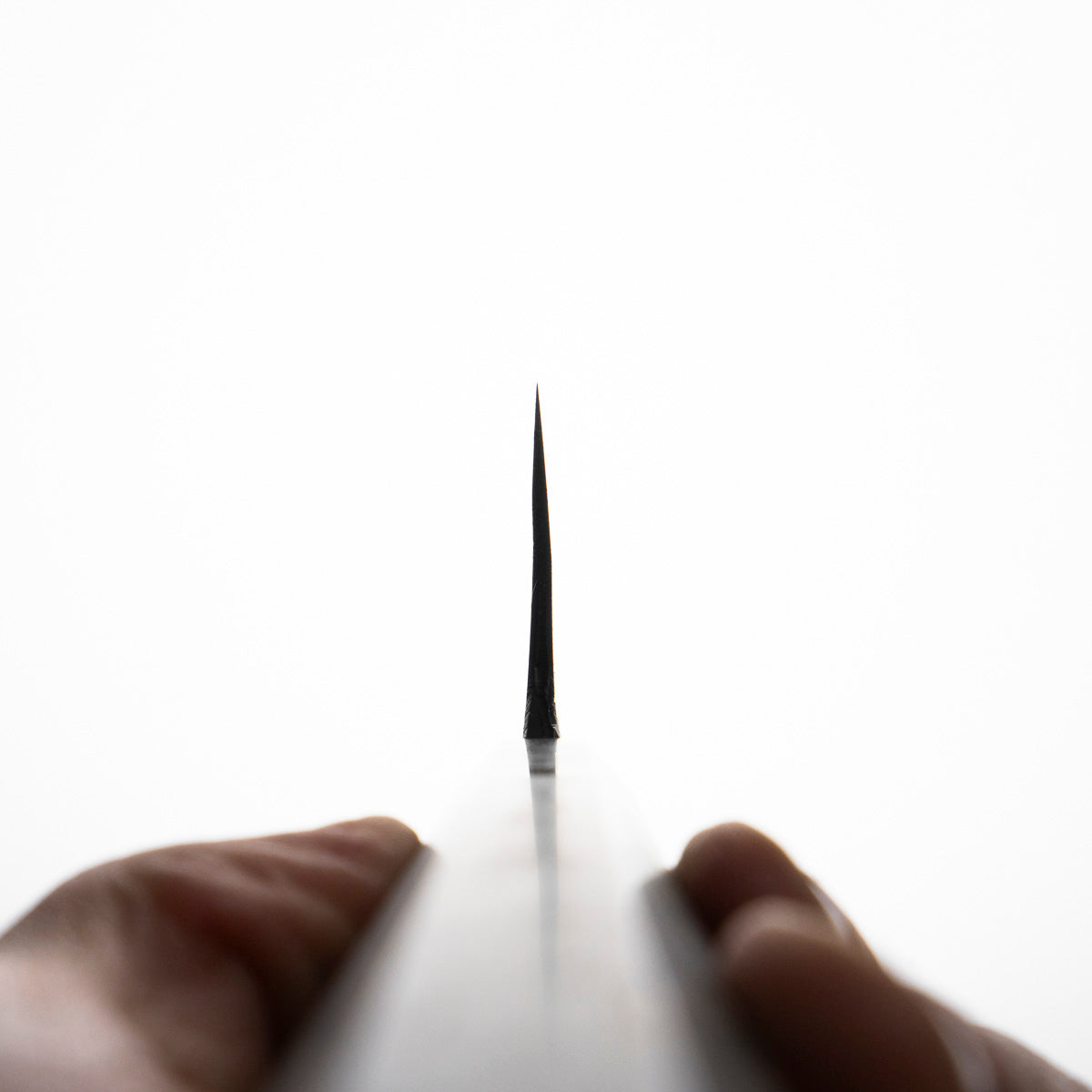 Japanese White Steel #2, a traditional high-carbon steel, is cherished for its purity and fine grain structure, enabling razor-sharp edges, at the cost of being reactive. It is one of the easiest steels to sharpen, but cannot be left wet for even short periods otherwise rust spots can occur. If you’re fastidious in your knife maintenance, this knife steel can be extremely rewarding to use.