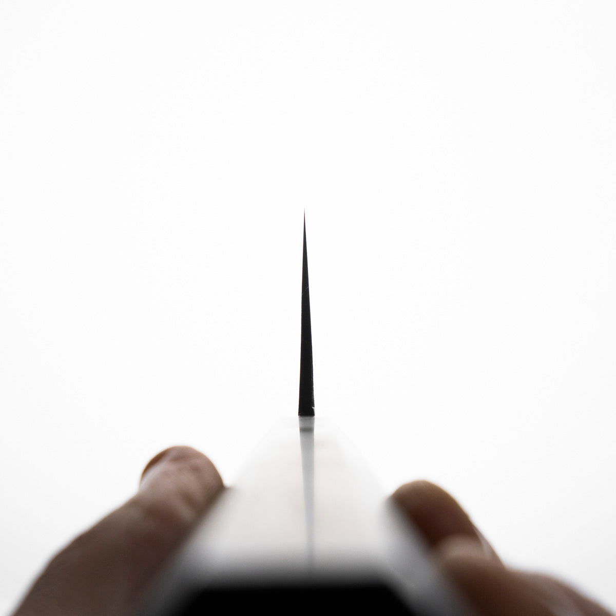 Japanese White Steel #2, a traditional high-carbon steel, is cherished for its purity and fine grain structure, enabling razor-sharp edges, at the cost of being reactive. It is one of the easiest steels to sharpen, but cannot be left wet for even short periods otherwise rust spots can occur. If you’re fastidious in your knife maintenance, this knife steel can be extremely rewarding to use.