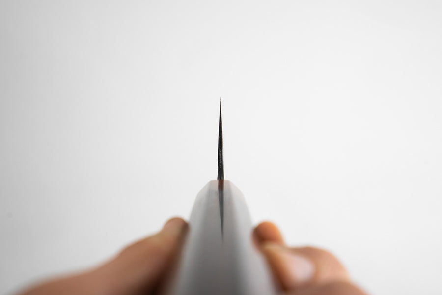 Embracing a rapid rise in popularity for his unique designs and committment to striving for perfection, Shunsuke Manaka is the man behind Kisuke knives. From the sketchbook to the kitchen, he is the sole craftsman behind the entire knifemaking process. Shunsuke engineers these knives using a process known as Warikomi, whereby a glowing hot piece of steel is split, and the core steel is wedged in and forged together. The split steel becomes the outer layers, and the core steel is exposed at the edge. This process produces a stronger, tougher more durable blade.