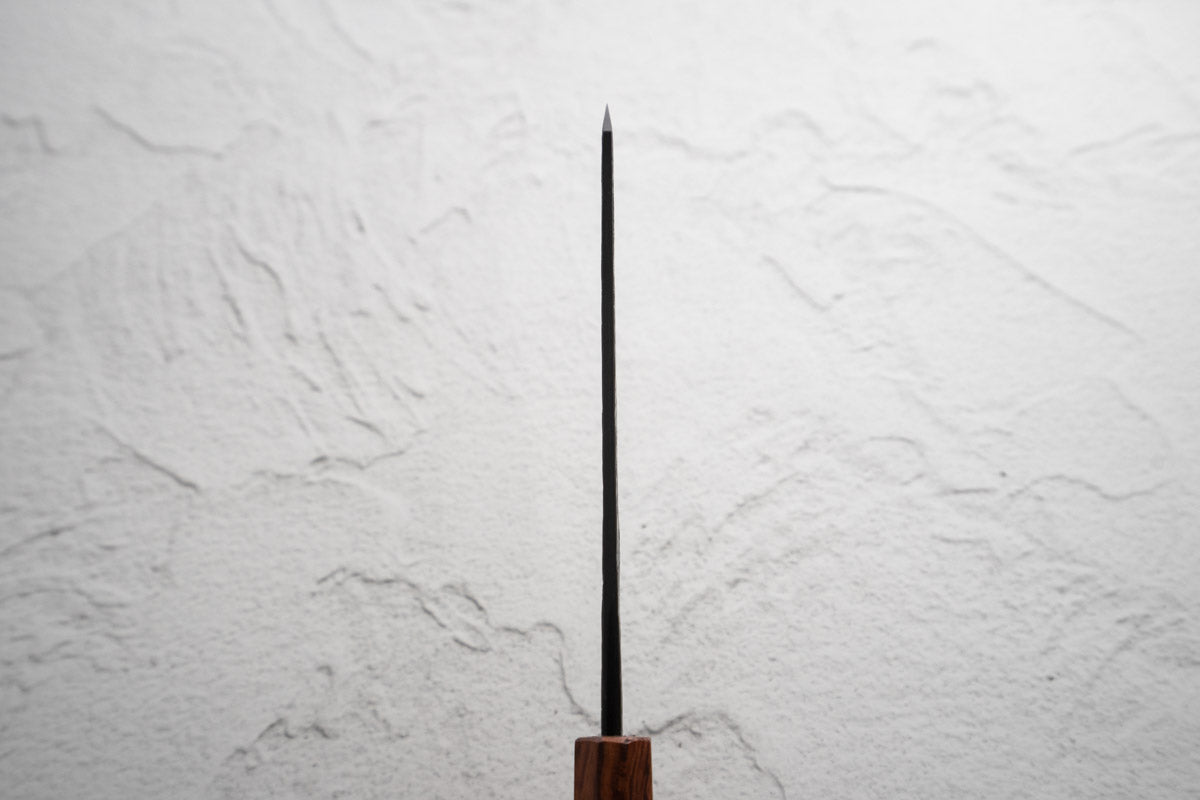 The Honesuki knife, a traditional Japanese boning knife, is uniquely crafted for poultry butchery. Its triangular, sturdy blade is adept at maneuvering around bones, joints, and tendons, offering precise control. With a pointed tip for detailed work, the Honesuki is indispensable for chefs specializing in meat preparation.