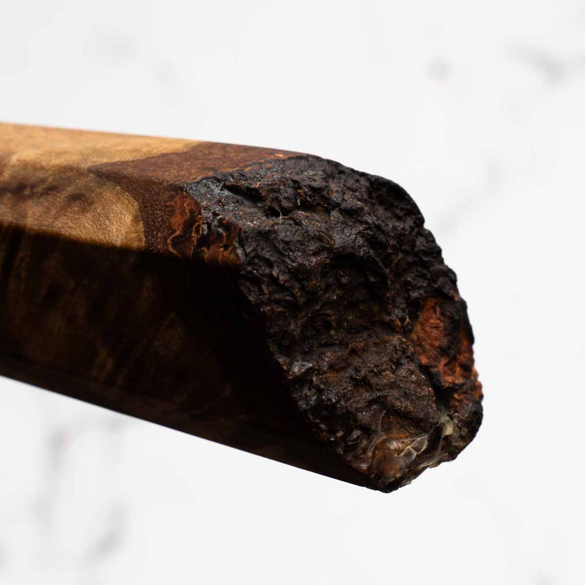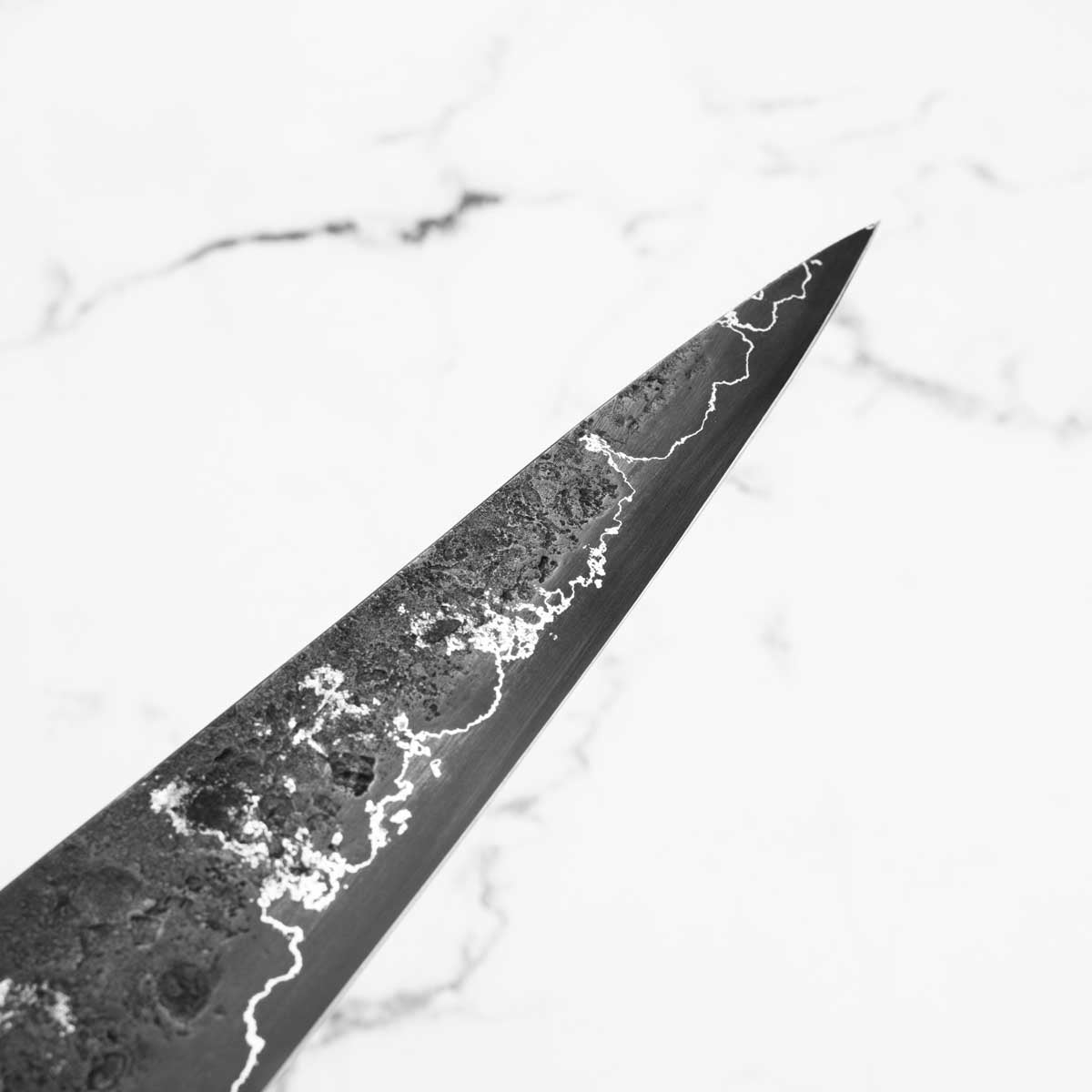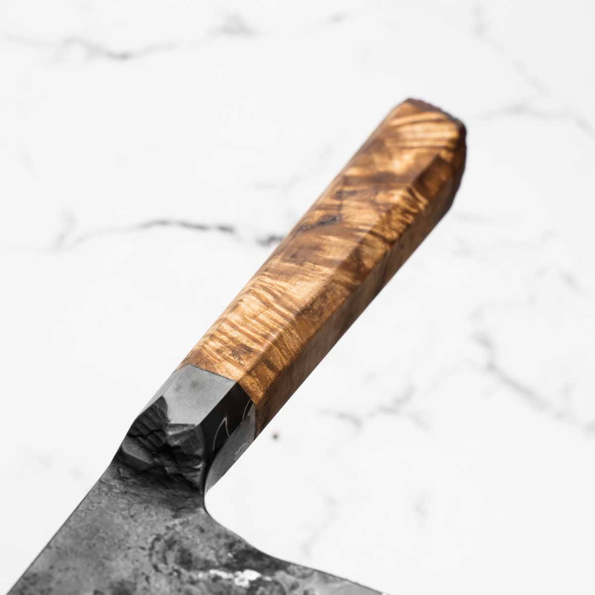 This knife is made from a high-carbon steel and as such, will require a little more care than a regular off-the-shelf knife. It must be dried shortly after use, as prolonged exposure to moisture can cause rust spots to appear. A very light coat of oil during storage also helps to prevent rust spots. A patina (colouration and seasoning of the steel) will occur with use.