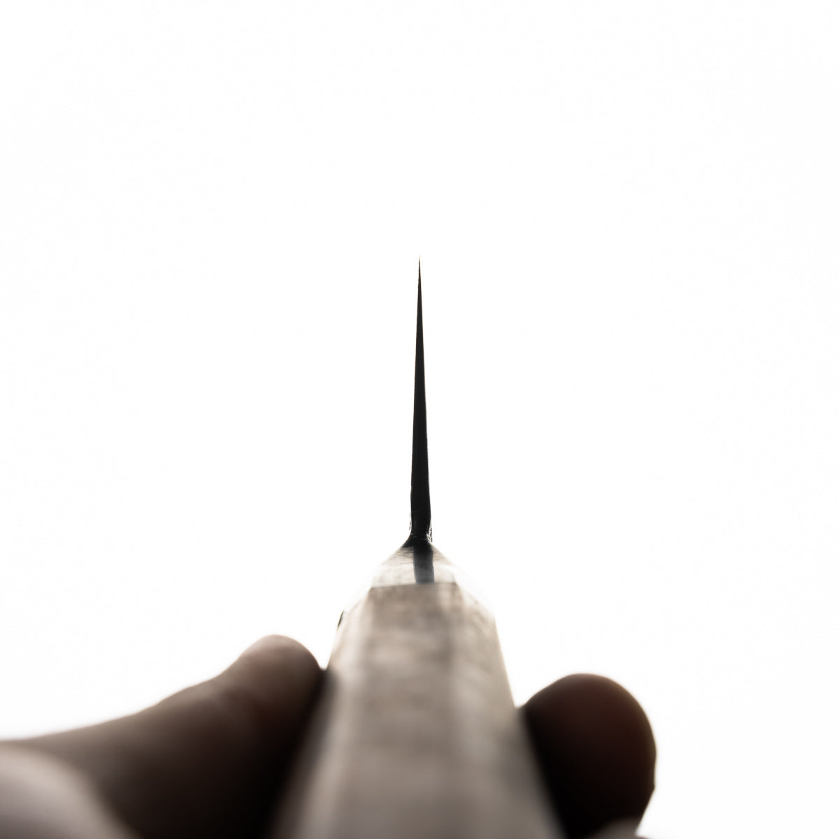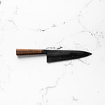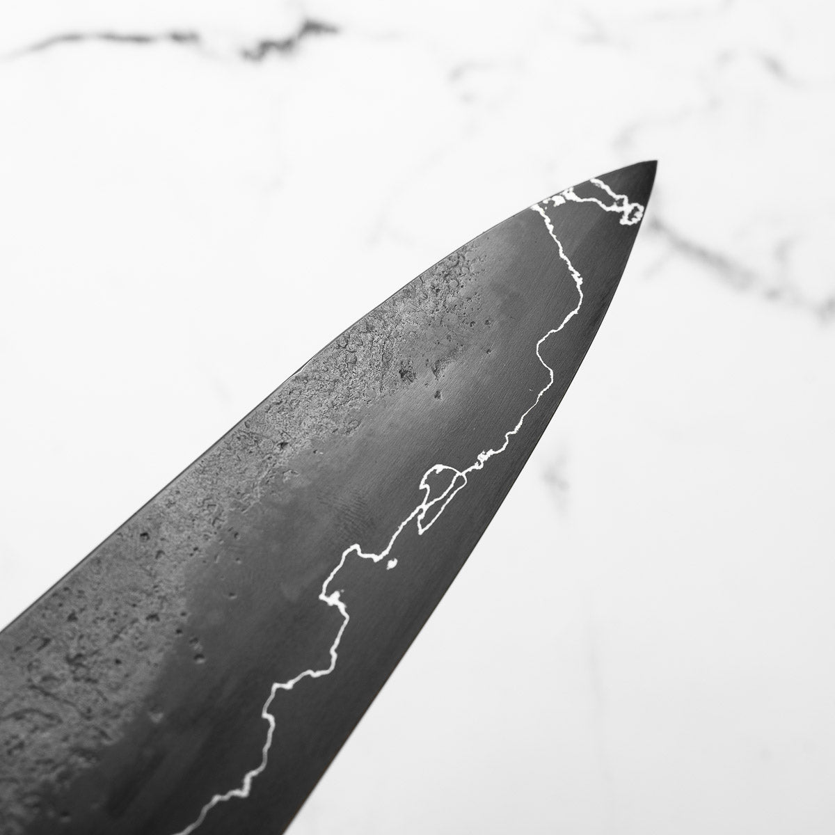This knife is made from a high-carbon steel and as such, will require a little more care than a regular off-the-shelf knife. It must be dried shortly after use, as prolonged exposure to moisture can cause rust spots to appear. A very light coat of oil during storage also helps to prevent rust spots. A patina (colouration and seasoning of the steel) will occur with use.
