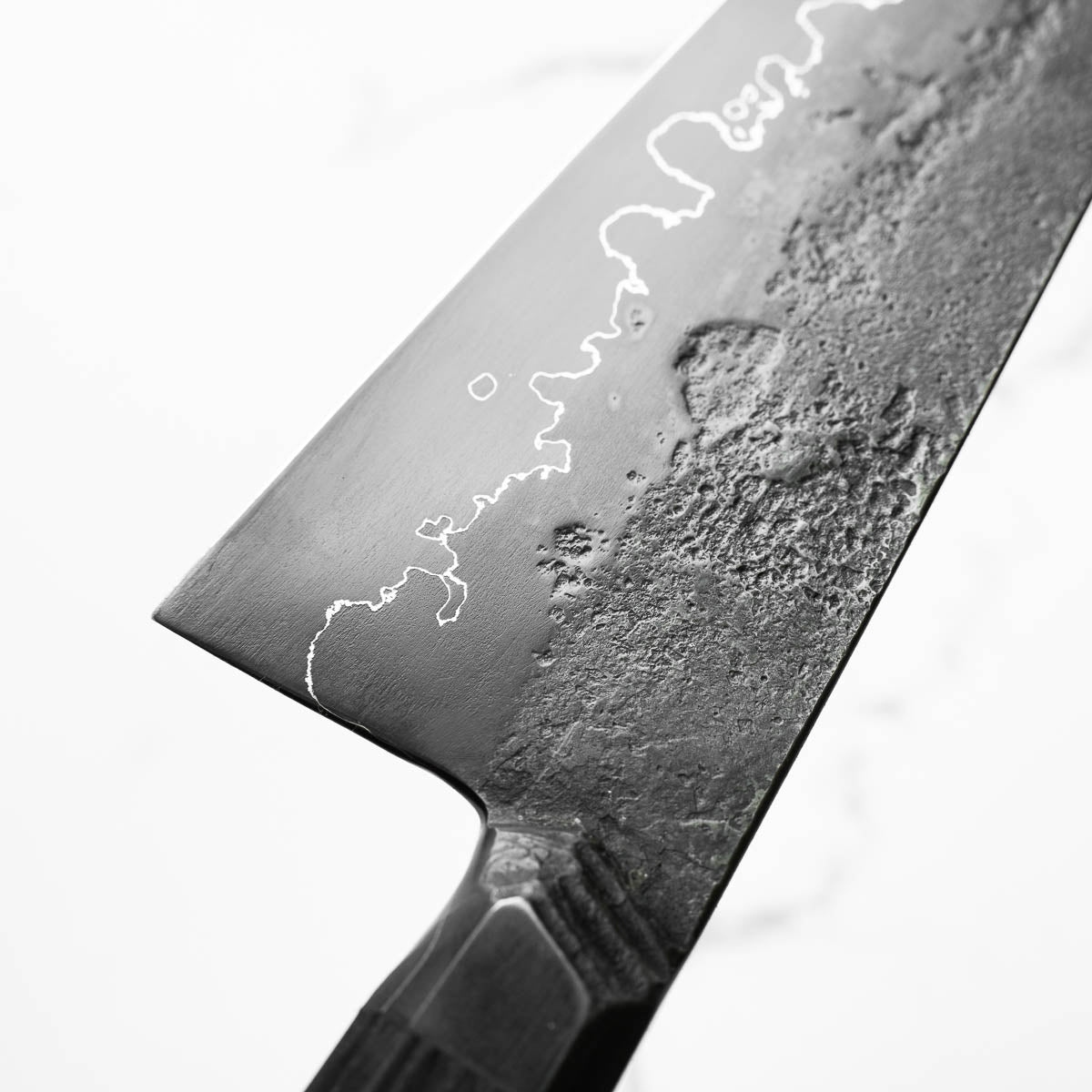 This knife is made from a high-carbon steel and as such, will require a little more care than a regular off-the-shelf knife. It must be dried shortly after use, as prolonged exposure to moisture can cause rust spots to appear. A very light coat of oil during storage also helps to prevent rust spots. A patina (colouration and seasoning of the steel) will occur with use.