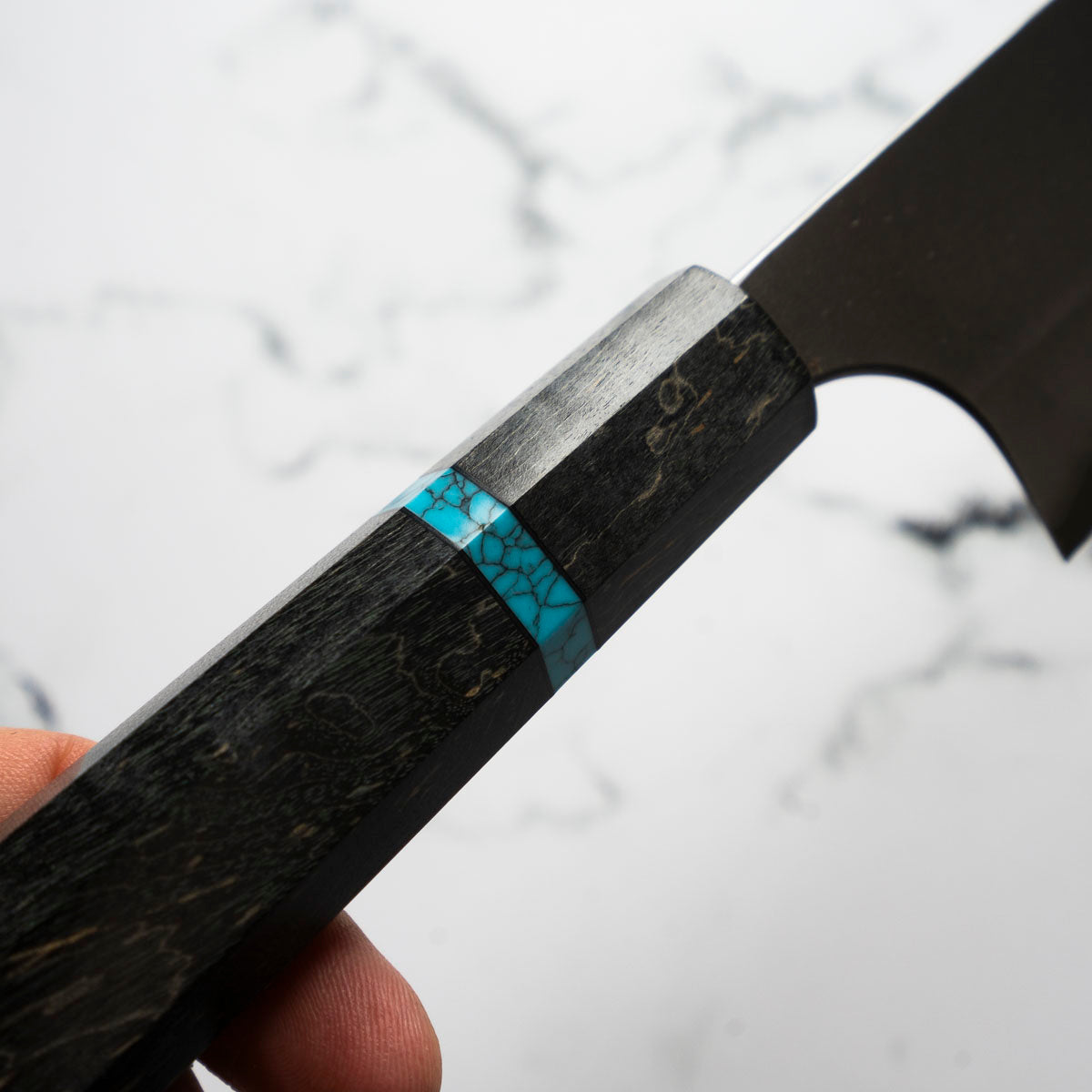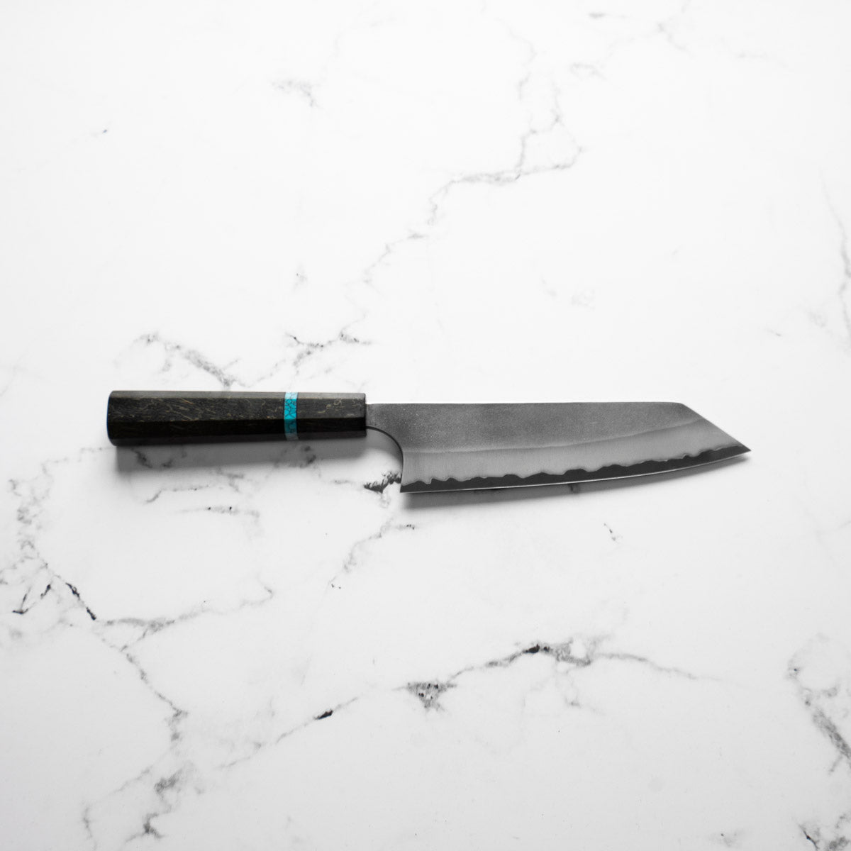 Japanese White Steel #2, a traditional high-carbon steel, is cherished for its purity and fine grain structure, enabling razor-sharp edges, at the cost of being reactive. It is one of the easiest steels to sharpen, but cannot be left wet for even short periods otherwise rust spots can occur. If you’re fastidious in your knife maintenance, this knife steel can be extremely rewarding to use.
