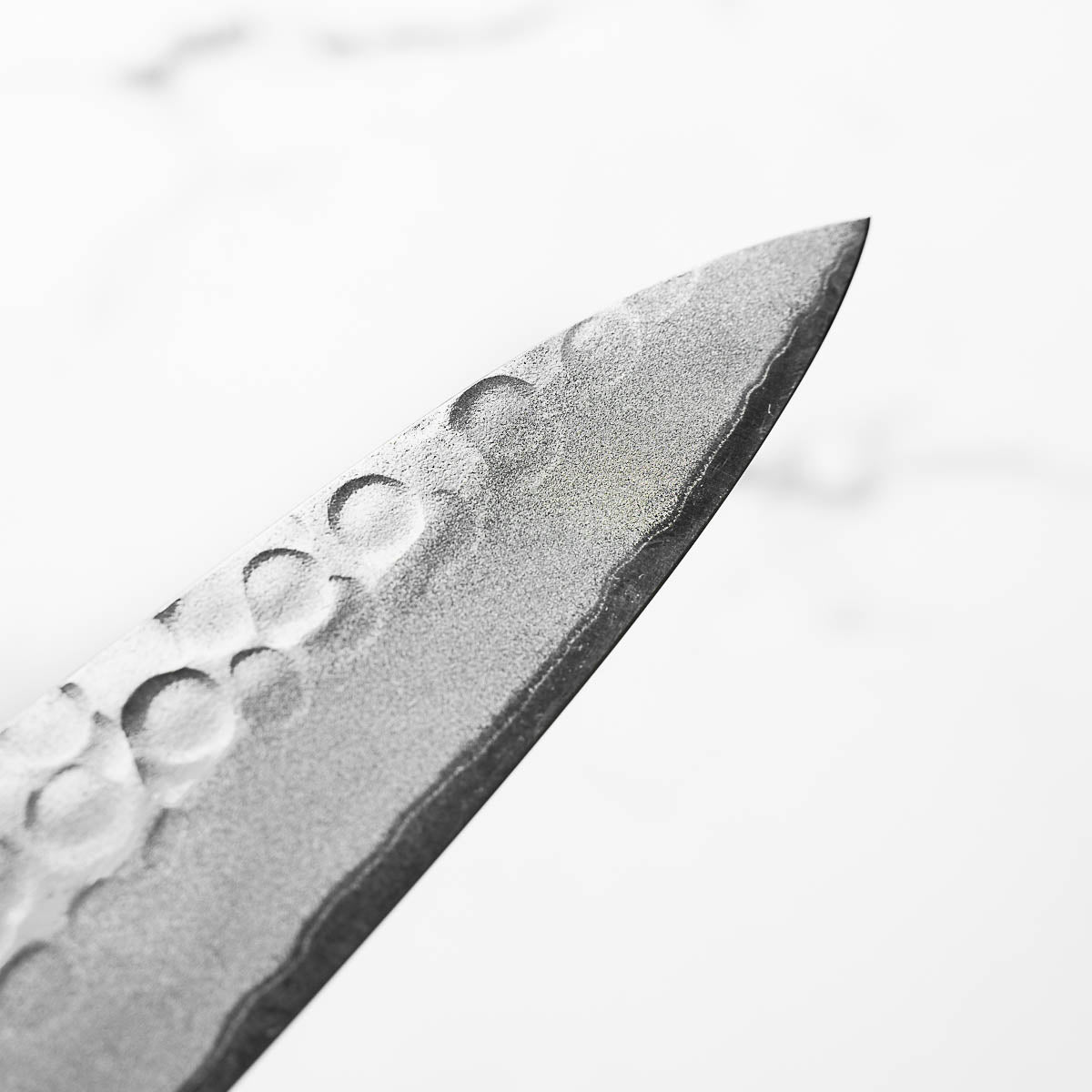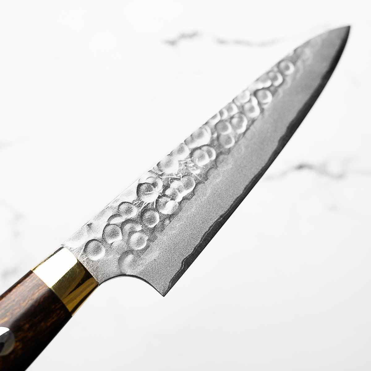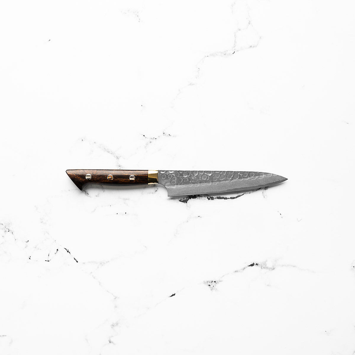 The Petty knife, a quintessential tool in Japanese cuisine, is a smaller utility knife used for precise, delicate tasks. Often considered a smaller sibling to the chef's knife, it excels in hand-held tasks like peeling, trimming, and intricate cutting. Its versatility makes it an essential for detailed culinary work.