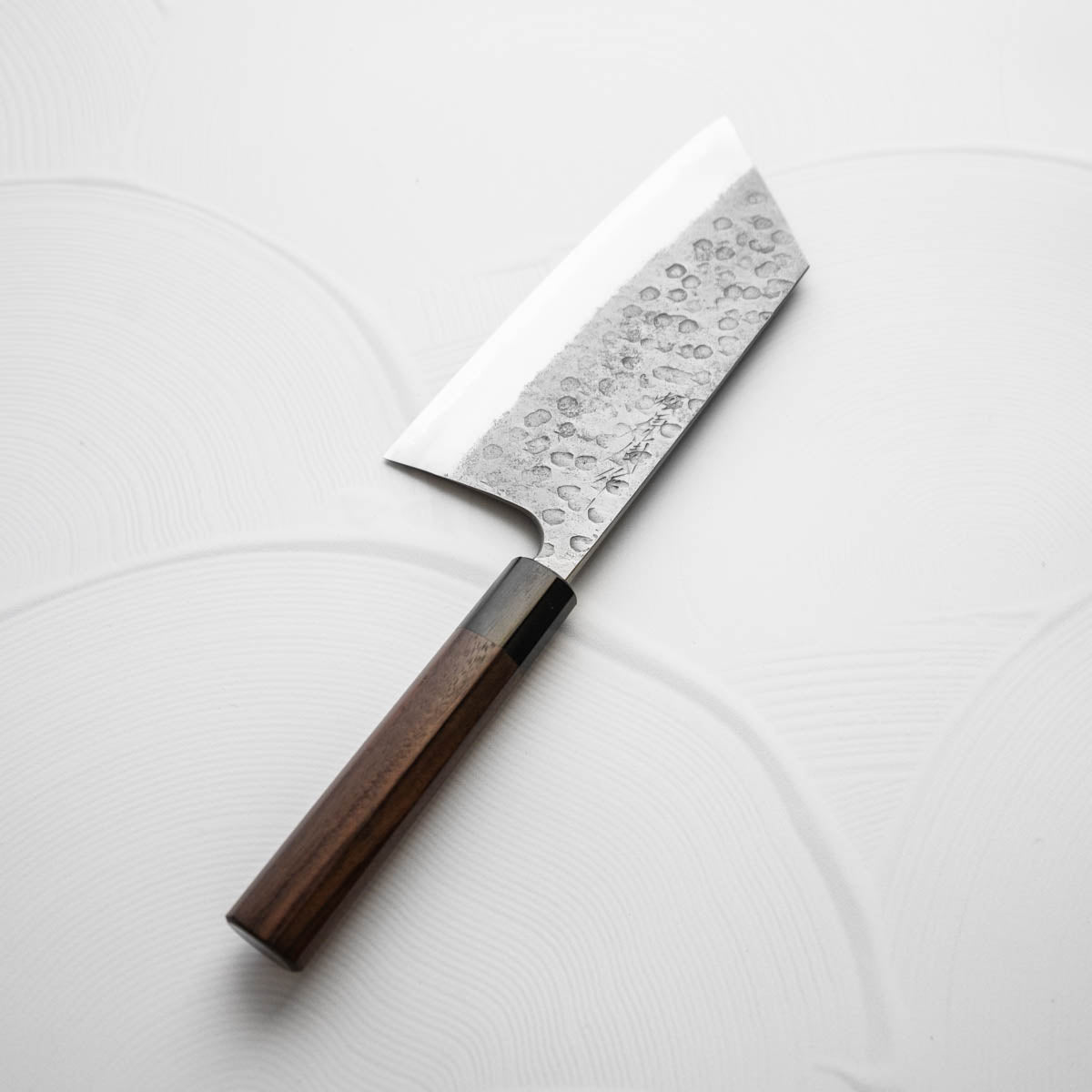 The Kiritsuke cleaver by Matsubara is a very unique shape. It features a robust, wide blade adept at slicing through large cuts of meat and bones with ease and efficiency. This cleaver combines traditional Japanese craftsmanship with functionality, essential for professional butchery.