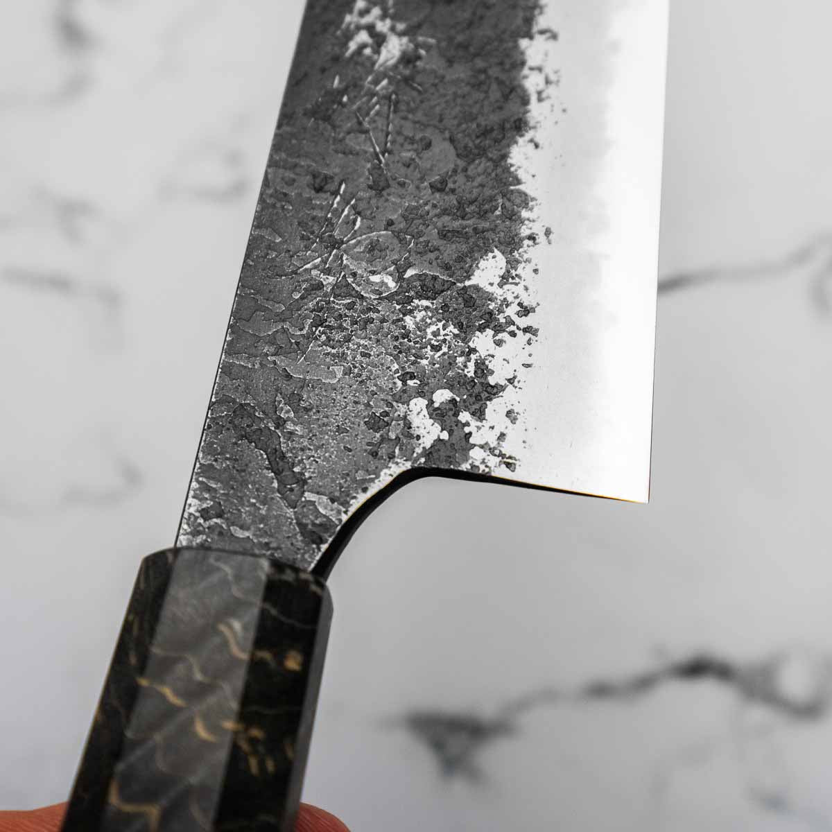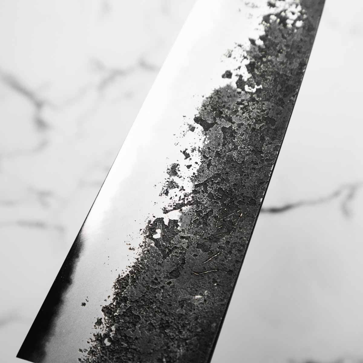 Japanese White Steel #2, a traditional high-carbon steel, is cherished for its purity and fine grain structure, enabling razor-sharp edges, at the cost of being reactive. It is one of the easiest steels to sharpen, but cannot be left wet for even short periods otherwise rust spots can occur. If you’re fastidious in your knife maintenance, this knife steel can be extremely rewarding to use.