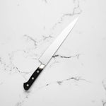 The Sujihiki knife, a traditional Japanese slicer, is designed for carving and fileting. With its long, narrow blade, typically ranging from 240mm to 330mm, it excels in creating clean, smooth cuts through meat and fish. Its length ensures long, uninterrupted strokes, making it perfect for precise slicing tasks.